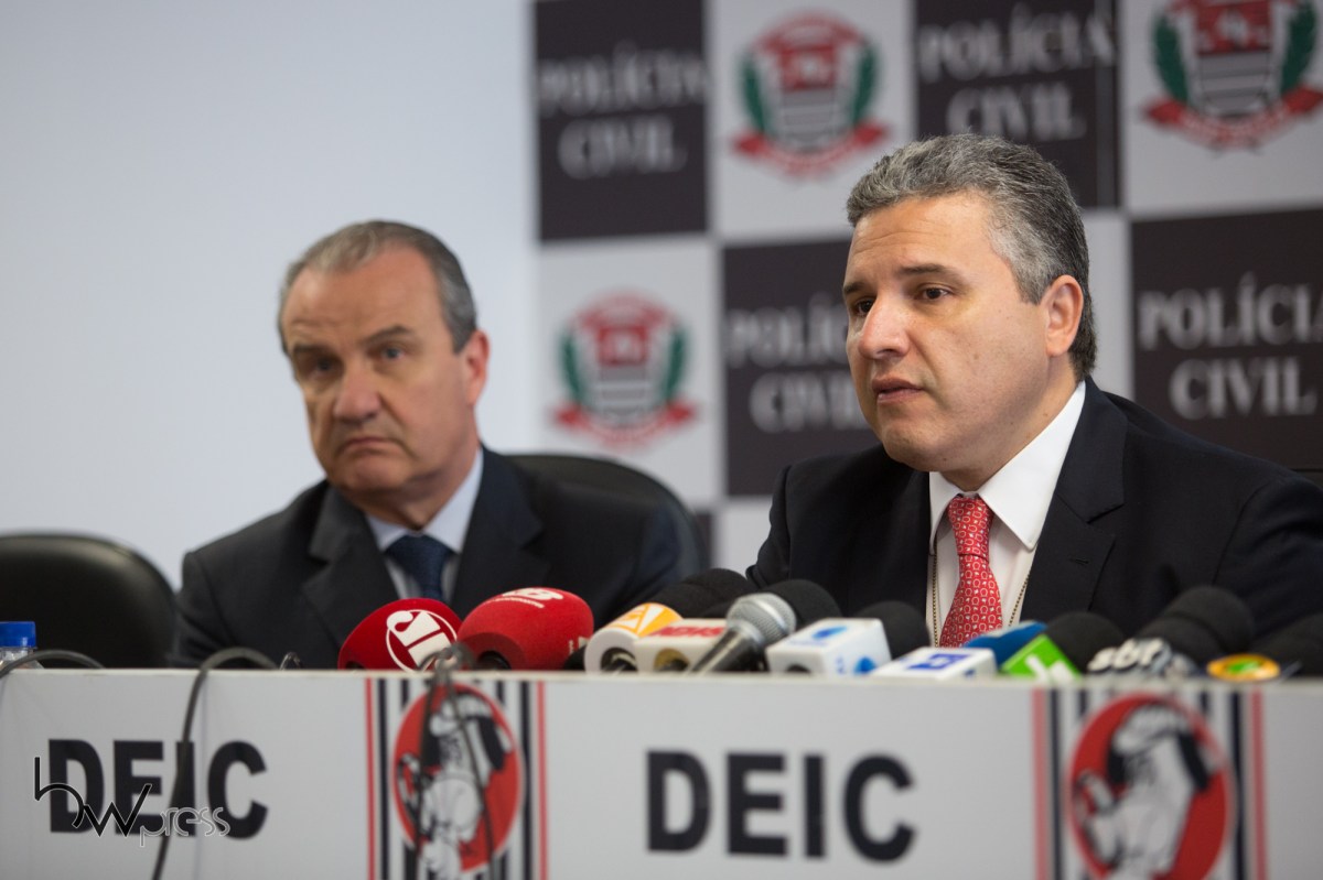 Fábio Pinheiro Lopes (D), Delegado da divisão de Roubo a Bancos, participa de entrevista coletiva na sede do DEIC, na zona norte de São Paulo (SP), neste terça feira (03).