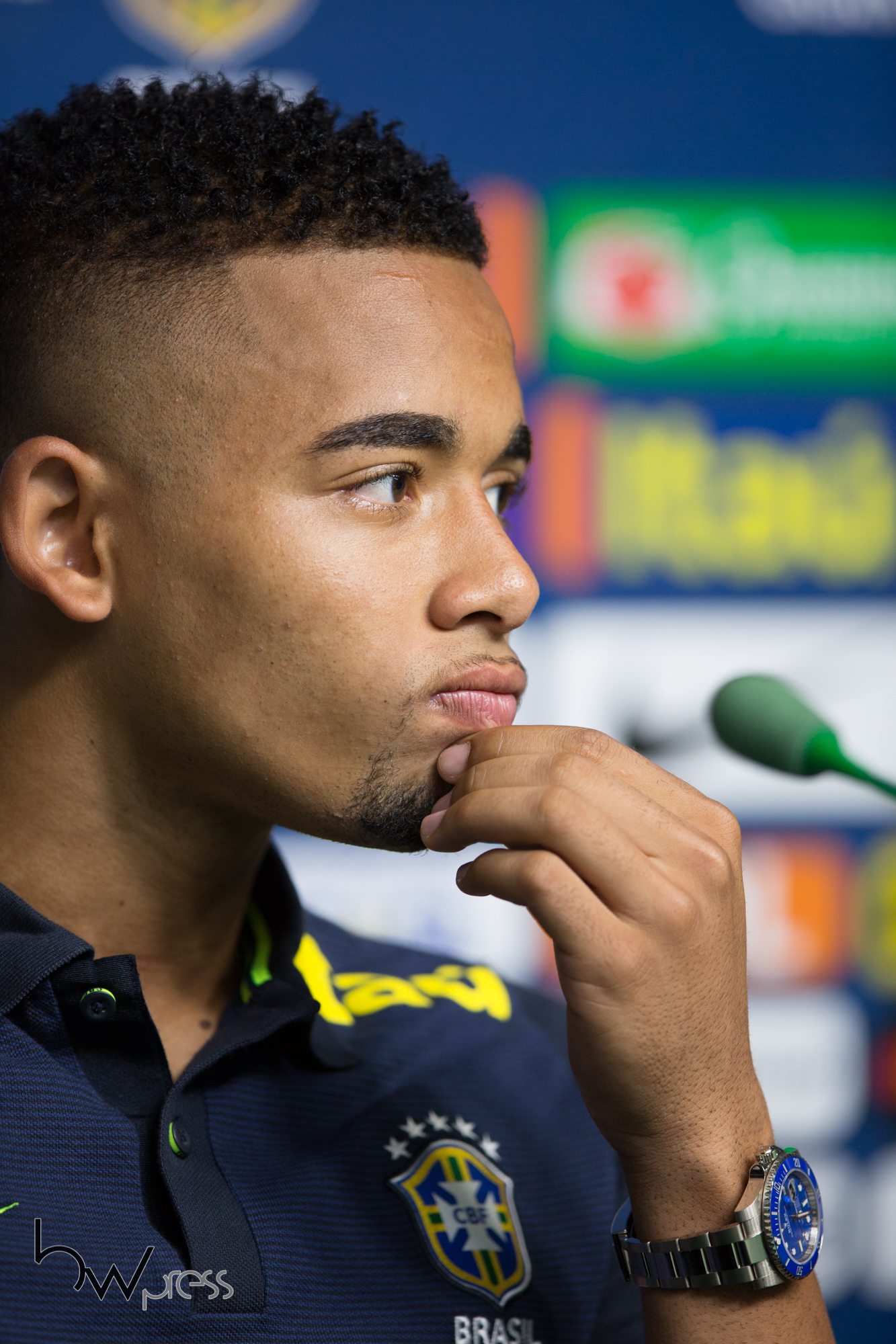 O jogador Gabriel Jesus participa de entrevista coletiva após o treino da seleção Brasileira de futebol, no CT do Palmeiras, na tarde deste domingo (08).