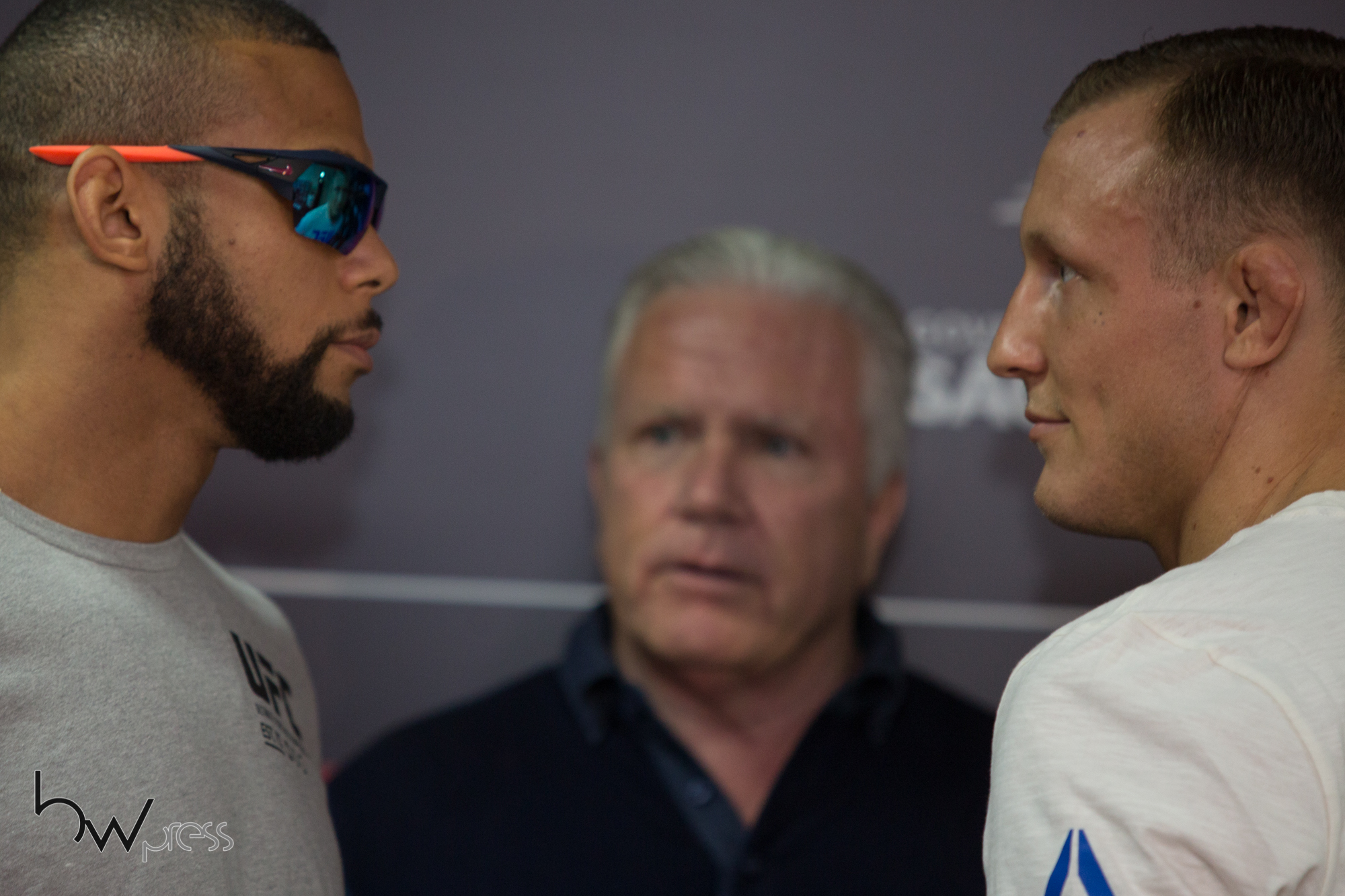 Thiago Santos (E) e Jack Hermansson, lutadores de UFC participam do “media day” no Hotel Matsubara, na zona sul de São Paulo (SP), nesta quinta feira (25). O evento é parte dos preparativos para o UFC Fight Night São Paulo, que acontece no Ginásio do Ibirapuera, no próximo sábado (28).