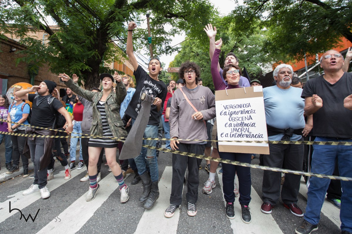 Grupos a favor e contra a filósofa norte americana Judith Butler, fazem manifestação durante evento no Sesc Pompéia, na zona oeste de São Paulo (SP), na manhã desta terça feira (07).