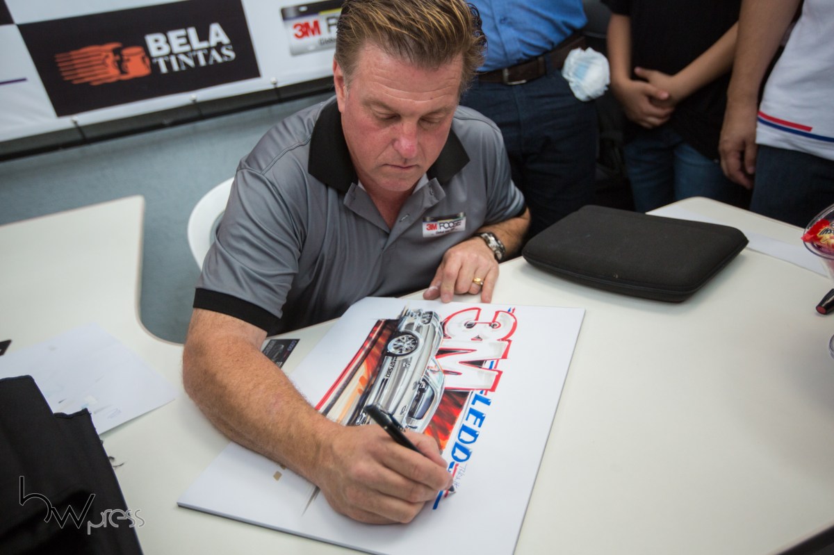 O designer americano Chip Foose, astro do programa Overhaulin’, transmitido no Brasil pelo Discovery, participa de evento promocional em uma oficina especializada em São Paulo, neste sábado (18).