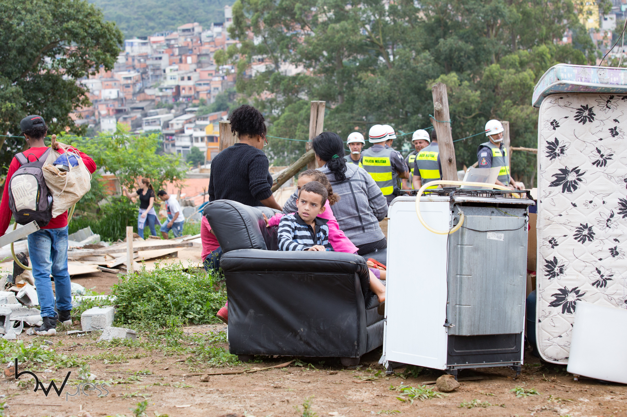 Policiais Militares acompanham a reintegração de posse de uma área na Avenida Bento Guelfi, no Jardim Iguatemi, zona leste de São Paulo (SP), na manhã desta terça-feira (21). Cerca de 50 famílias que viviam no local, tiveram seus pertences levados para um galpão e as casas e barracos foram derrubados.