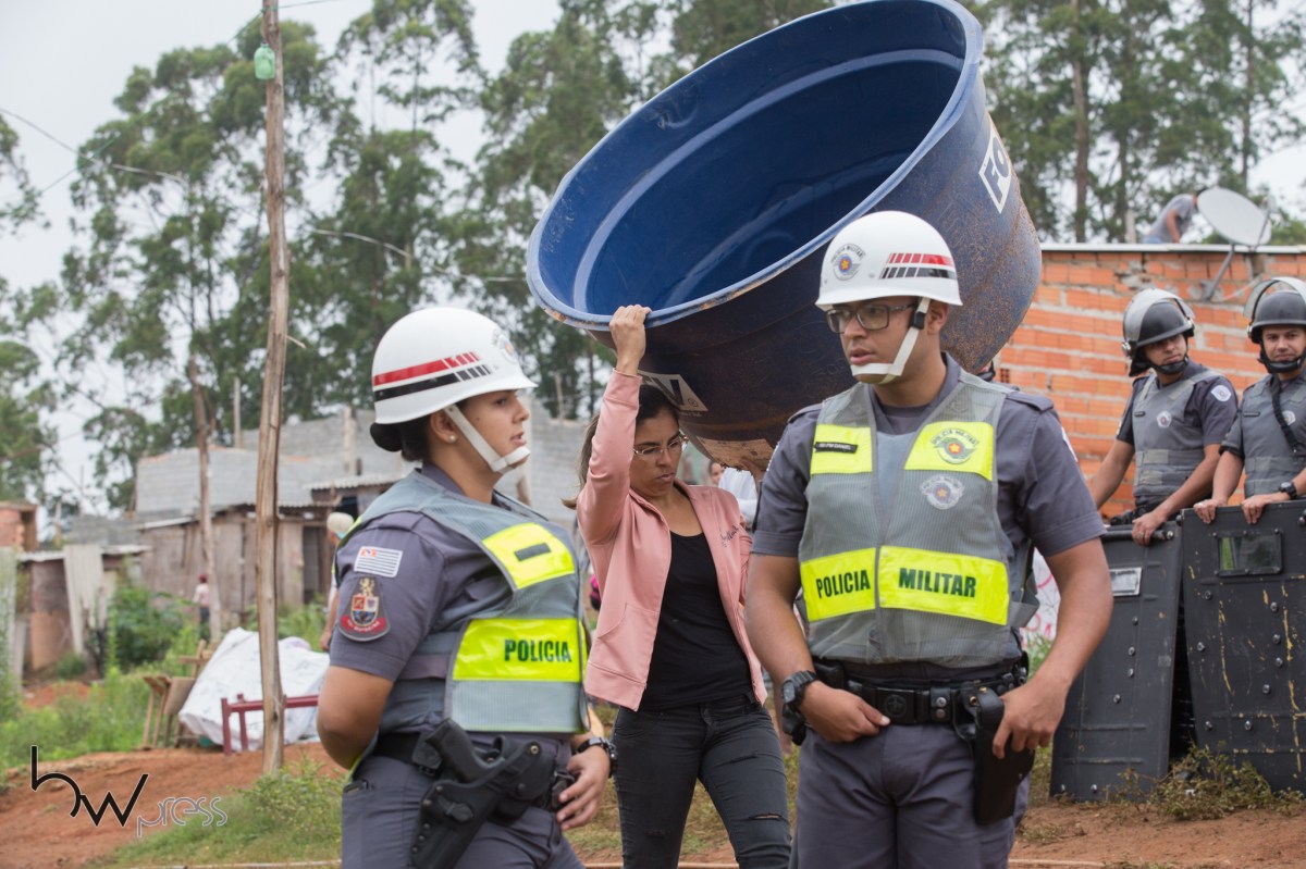 Policiais Militares acompanham a reintegração de posse de uma área na Avenida Bento Guelfi, no Jardim Iguatemi, zona leste de São Paulo (SP), na manhã desta terça-feira (21). Cerca de 50 famílias que viviam no local, tiveram seus pertences levados para um galpão e as casas e barracos foram derrubados.
