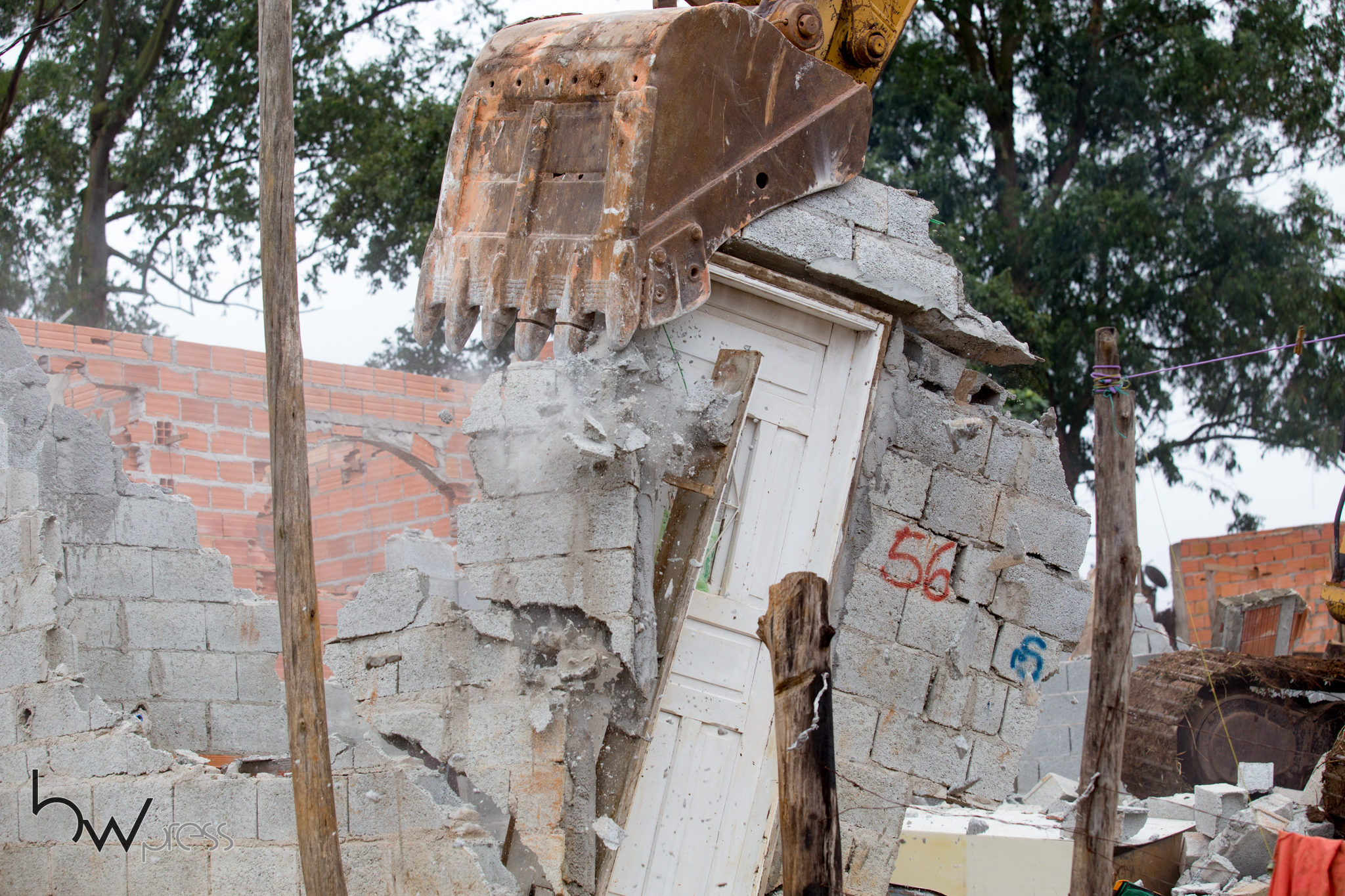 Policiais Militares acompanham a reintegração de posse de uma área na Avenida Bento Guelfi, no Jardim Iguatemi, zona leste de São Paulo (SP), na manhã desta terça-feira (21). Cerca de 50 famílias que viviam no local, tiveram seus pertences levados para um galpão e as casas e barracos foram derrubados.