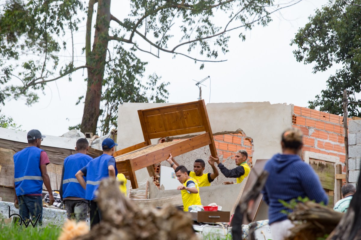 Policiais Militares acompanham a reintegração de posse de uma área na Avenida Bento Guelfi, no Jardim Iguatemi, zona leste de São Paulo (SP), na manhã desta terça-feira (21). Cerca de 50 famílias que viviam no local, tiveram seus pertences levados para um galpão e as casas e barracos foram derrubados.