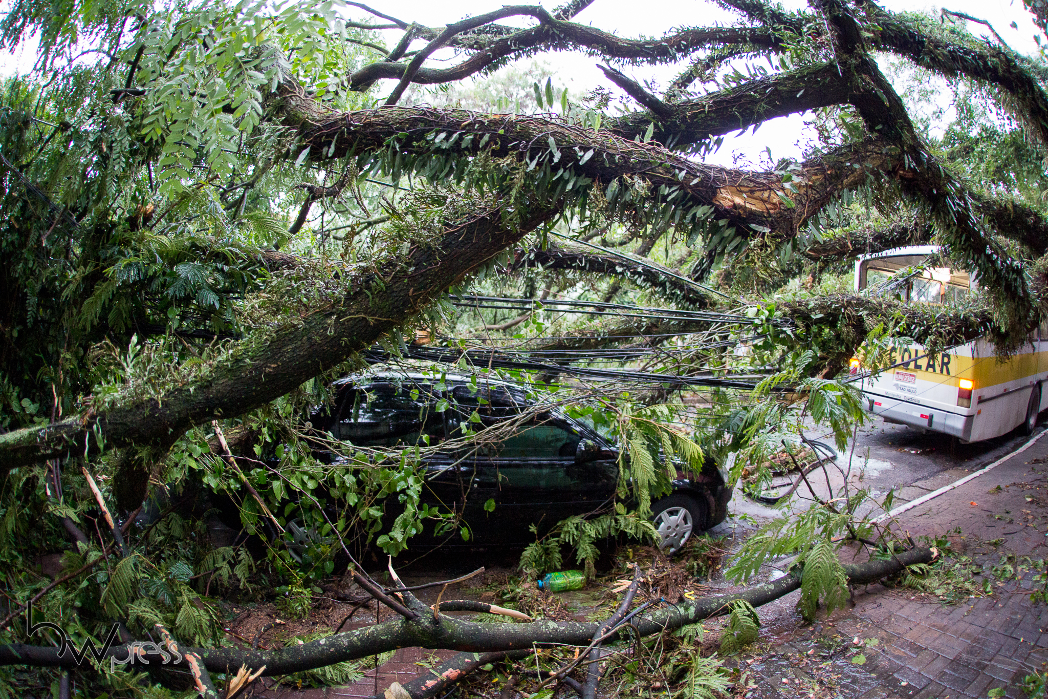 Árvore de grande porte cai sobre um automóvel e um ônibus escolar, na Avenida Professora Virgília Rodrigues Alves de Carvalho Pinto, esquina com a Rua Lavínia Pacheco e Silva, no bairro do Tucuruvi, zona norte de São Paulo (SP), nesta segunda feira (12). No automóvel estavam 3 pessoas, que foram resgatadas sem ferimentos. O ônibus estava vazio.