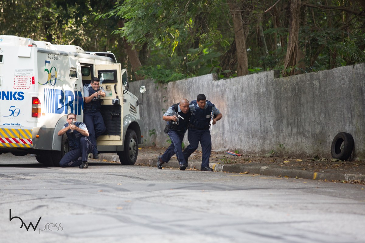 Policiais da ROTA realizam exercício simulado de roubo a carro forte, no bairro do Tremembé, na zona norte de São Paulo (SP), nesta segunda feira (12).