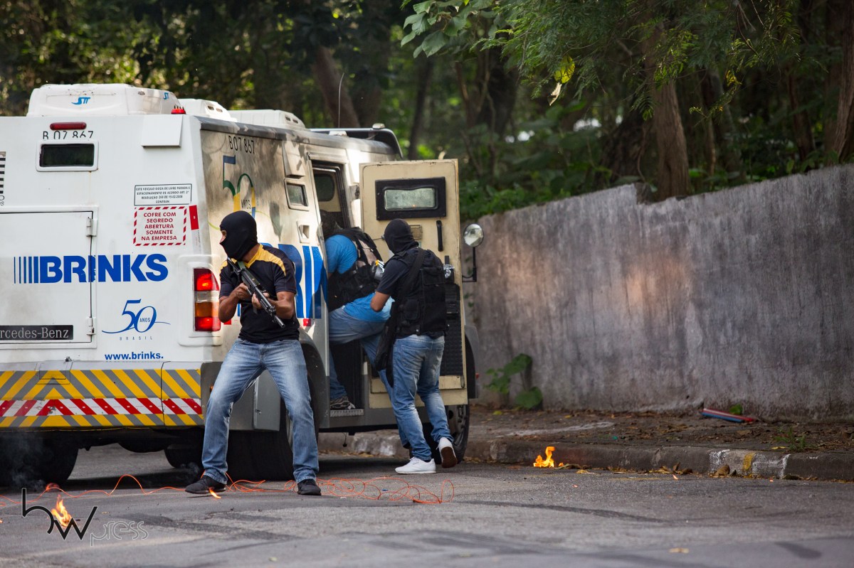 Policiais da ROTA realizam exercício simulado de roubo a carro forte, no bairro do Tremembé, na zona norte de São Paulo (SP), nesta segunda feira (12).