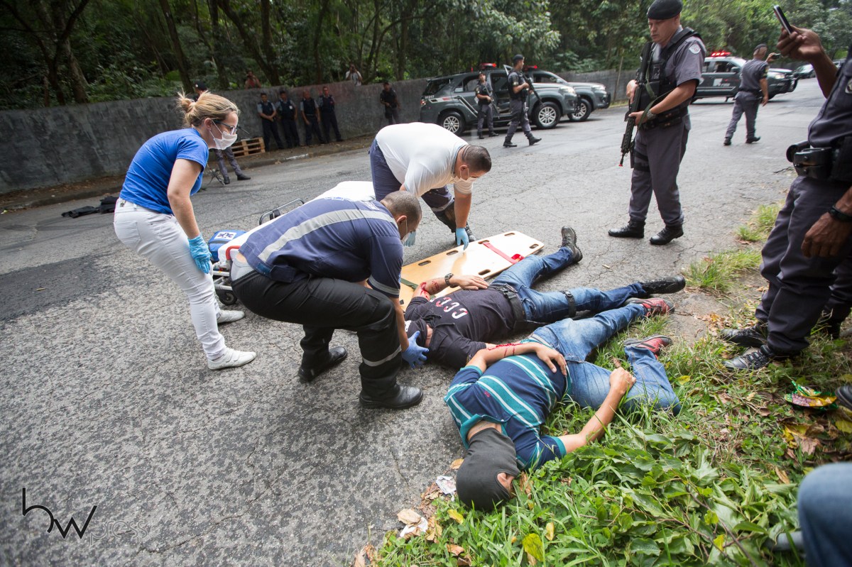 Policiais da ROTA realizam exercício simulado de roubo a carro forte, no bairro do Tremembé, na zona norte de São Paulo (SP), nesta segunda feira (12).