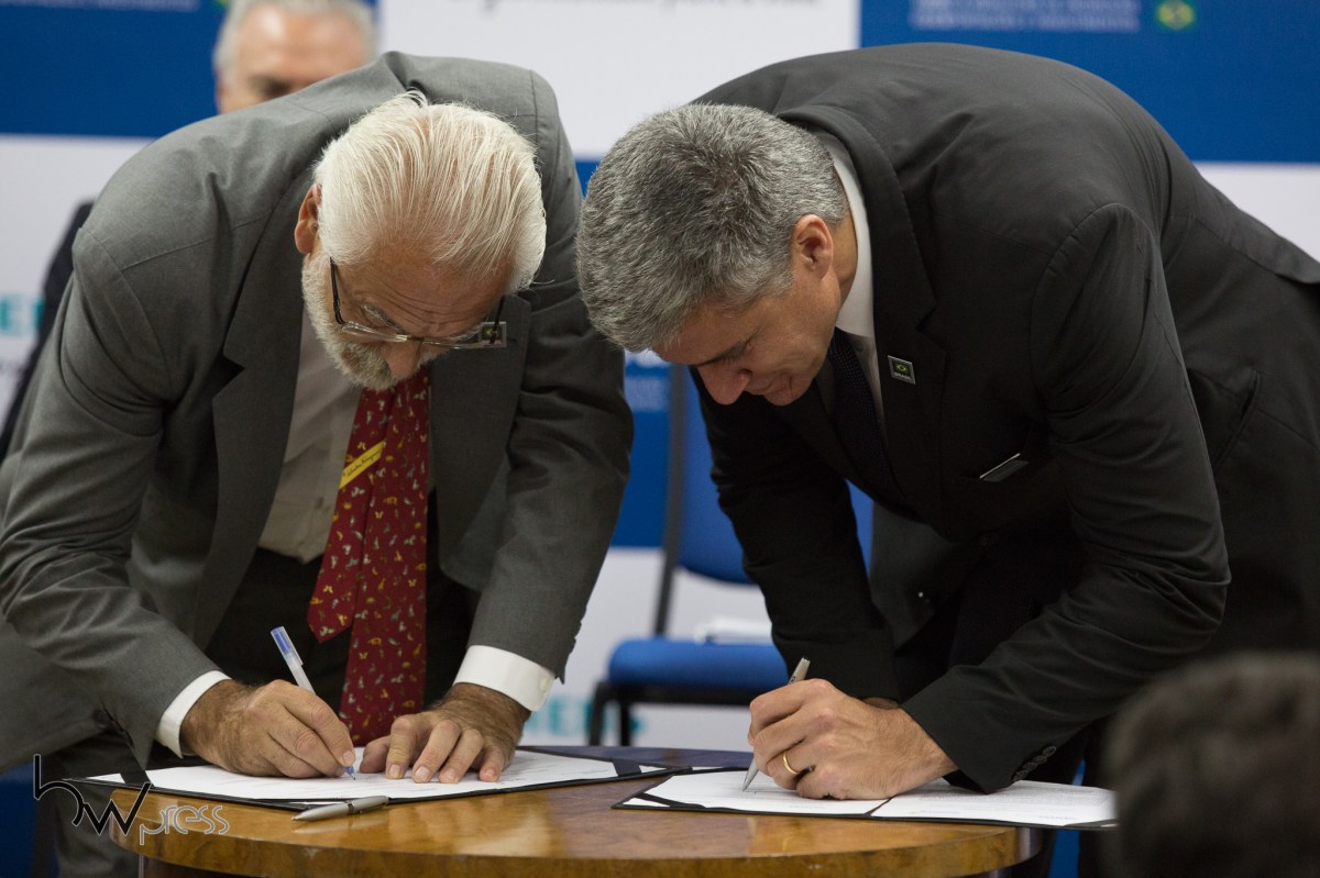 Roberto Jaguaribe e André Clark, assinam acordo entre a Agência Brasileira de Promoção de Exportações e Investimentos – APEX e a Siemens, na sede da Associação Comercial de São Paulo (ACSP), nesta terça feira (13).