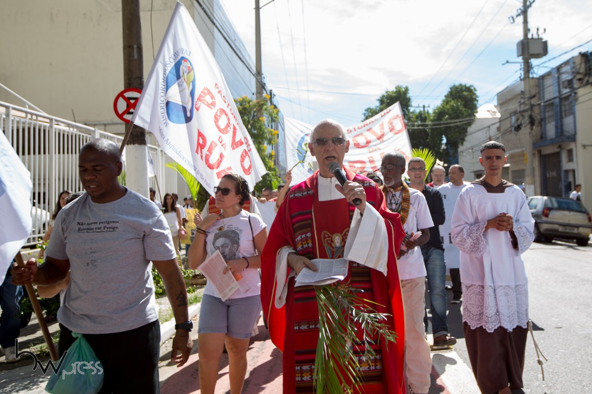 Ato em defesa do Padre Julio Lancellotti, coordenador da Pastoral do Povo de Rua de São Paulo, no bairro da Moóca, neste domingo (25). O religioso vem recebendo ameaças de morte pelas redes sociais. O caso está sendo investigado pelo Ministério Público de São Paulo.