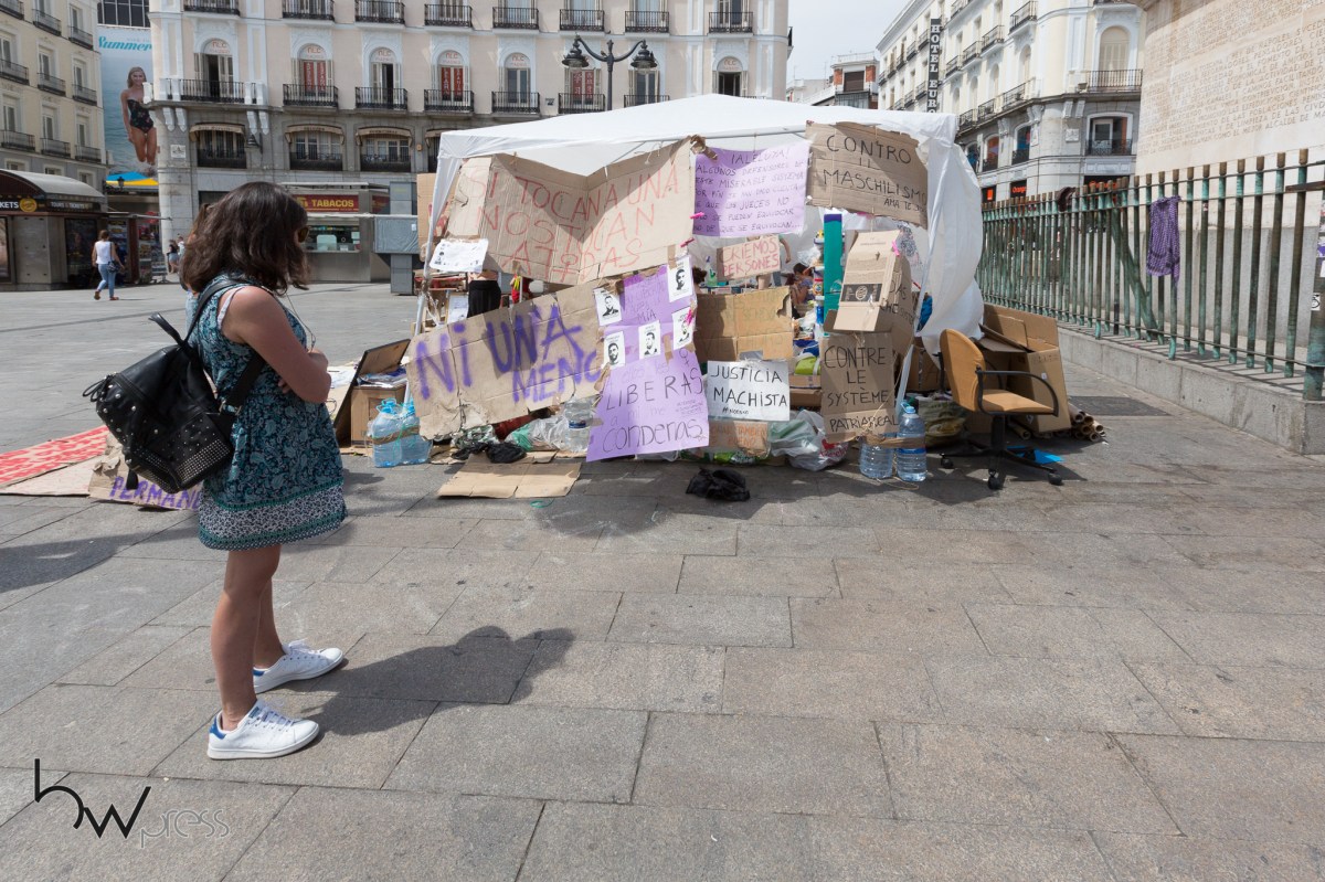 Ativistas acampadas na Puerta del Sol, no centro de Madrid, Espanha, nesta quarta feira (27). O grupo protesta contra abusos e violência contra mulheres e crianças. Incluem na pauta, o protesto contra o grupo denominado “La Manada” (5 homens que abusaram sexualmente de uma jovem em 2016 e foram soltos pela justiça).