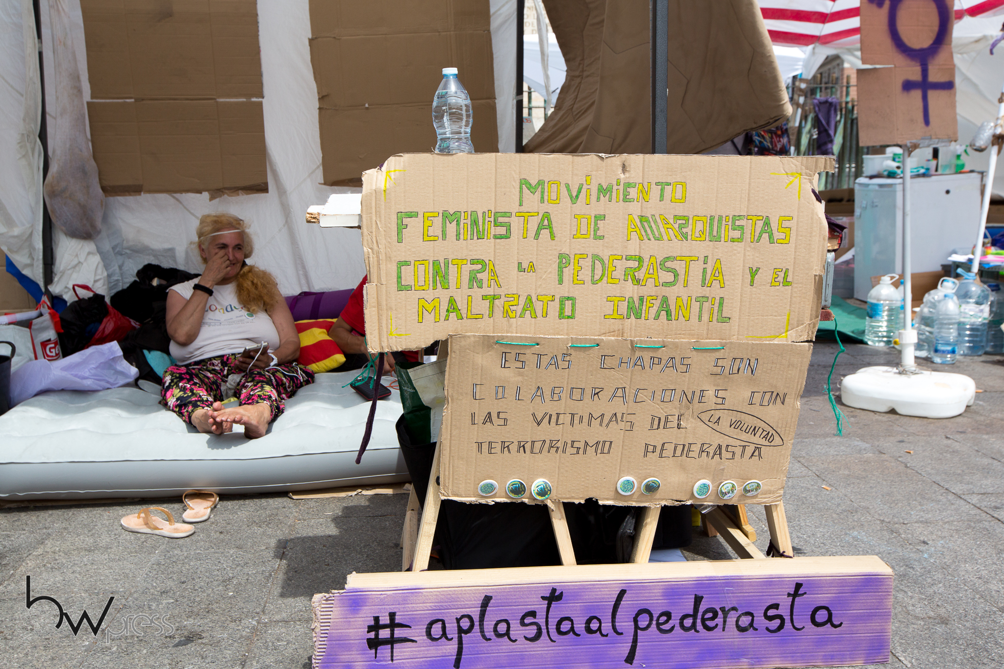 Ativistas acampadas na Puerta del Sol, no centro de Madrid, Espanha, nesta quarta feira (27). O grupo protesta contra abusos e violência contra mulheres e crianças. Incluem na pauta, o protesto contra o grupo denominado “La Manada” (5 homens que abusaram sexualmente de uma jovem em 2016 e foram soltos pela justiça).