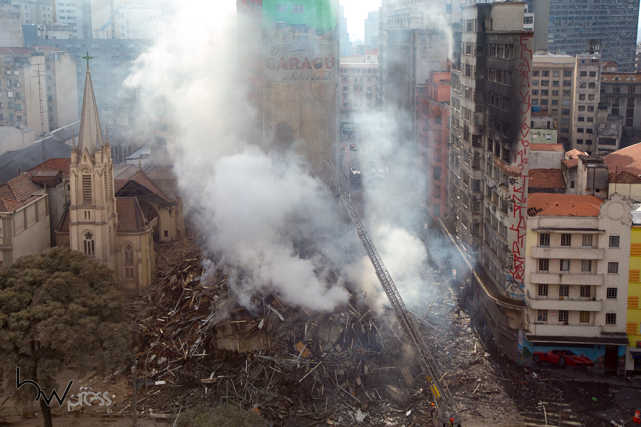 Bombeiros durante o trabalho de rescaldo e busca de possíveis vítimas do incêndio que atingiu 2 edifícios no centro da cidade de São Paulo, na madrugada desta terça feira (01). Um dos edifícios já abrigou um escritório da Polícia Federal e acabou desmoronando.
