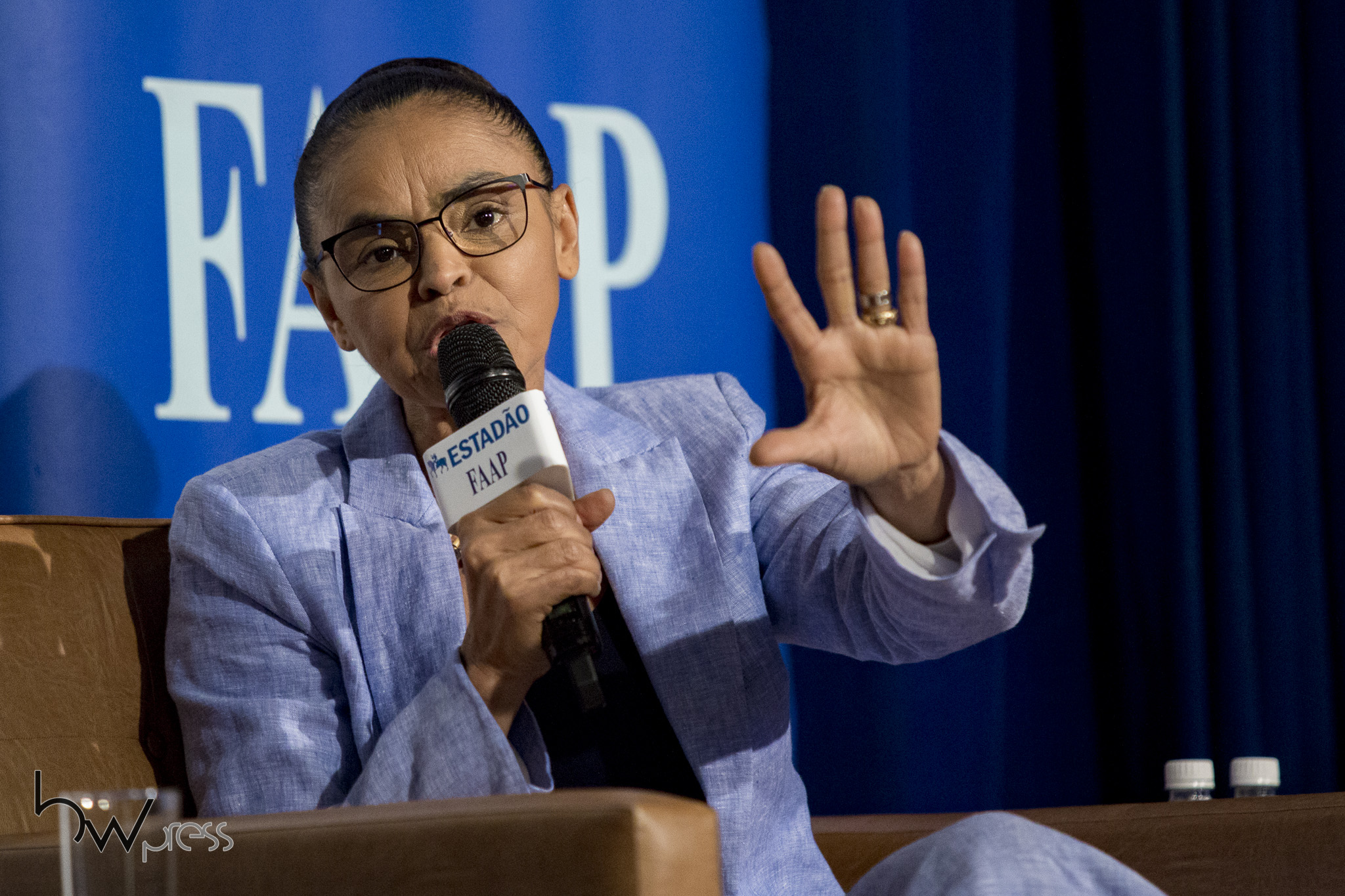 Marina Silva, candidata a Presidente da República pela REDE, durante sabatina na FAAP, em São Paulo (SP), nesta terça feira (28).