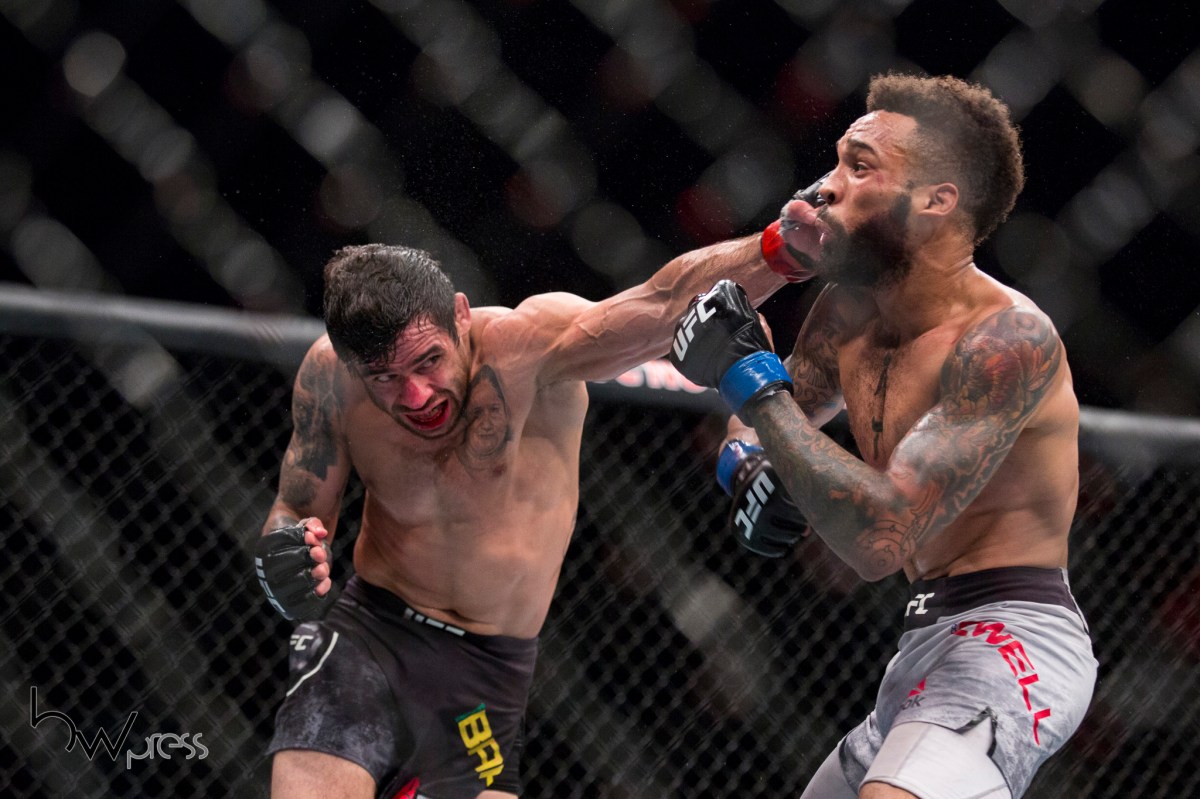 Luta durante o UFC Fight Night São Paulo, no Ginásio do Ibirapuera, na zona sul de São Paulo (SP), neste sábado (22).
