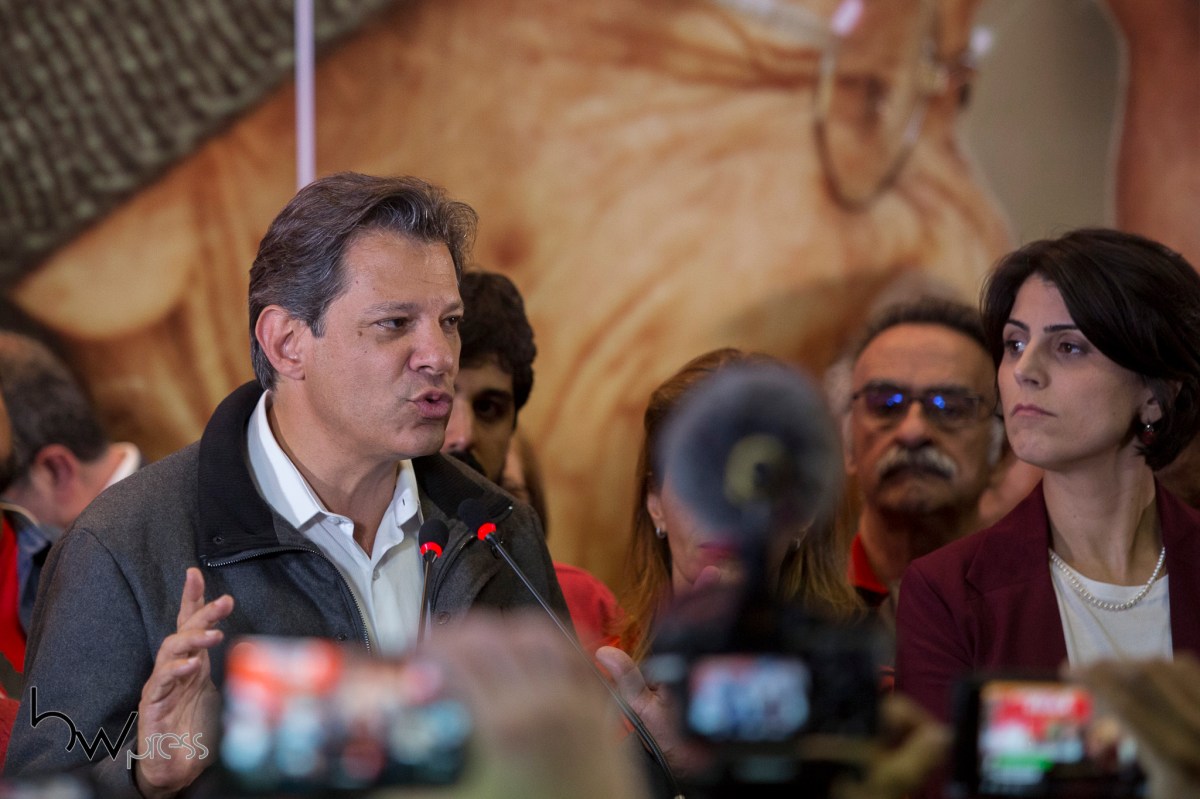 Fernando Haddad, candidato do PT, fala com a imprensa após a confirmação do segundo lugar no primeiro turno da eleição para Presidente do Brasil, no Hotel Pestana, na zona sul de São Paulo, neste domingo (07).