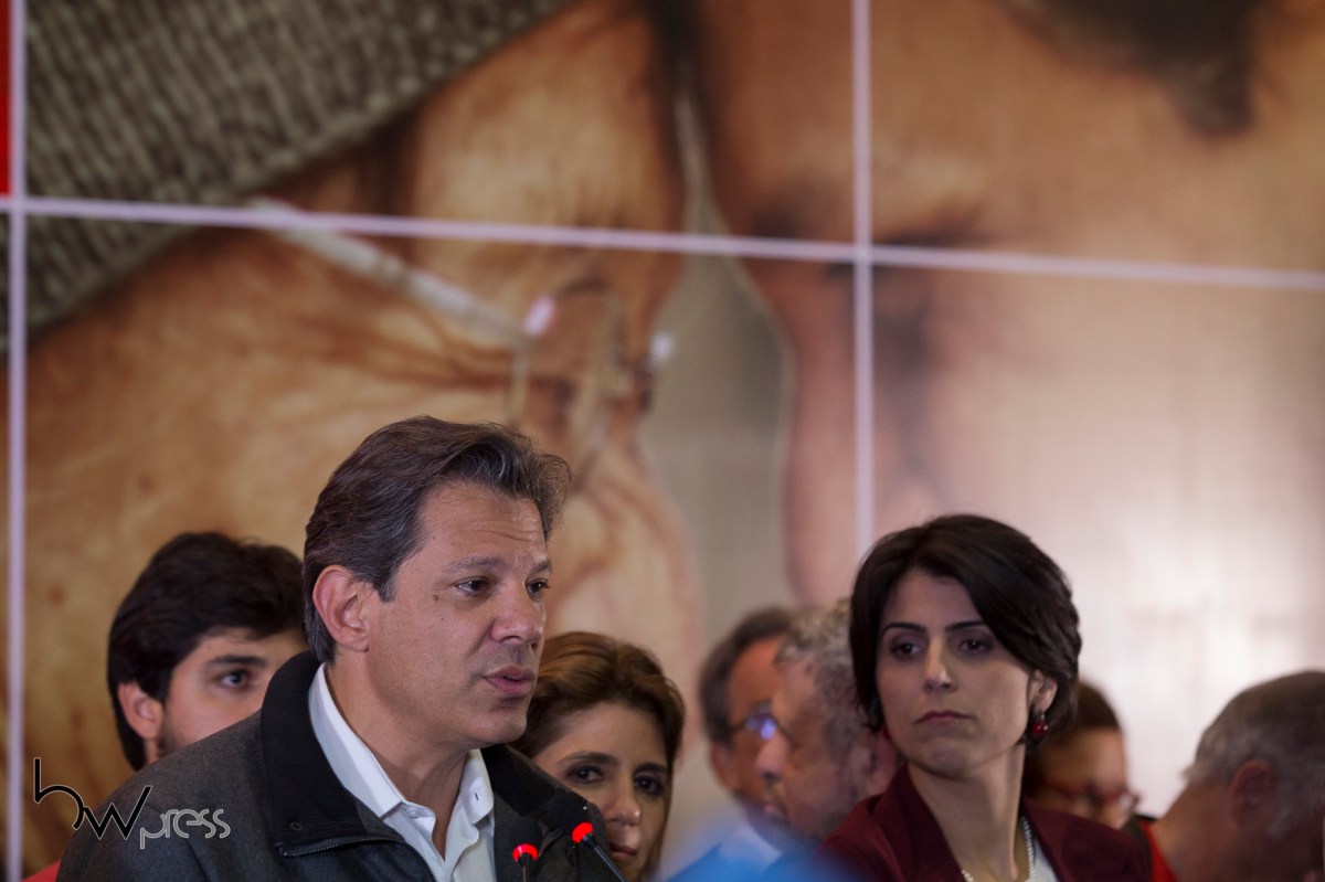 Fernando Haddad, candidato do PT, fala com a imprensa após a confirmação do segundo lugar no primeiro turno da eleição para Presidente do Brasil, no Hotel Pestana, na zona sul de São Paulo, neste domingo (07).