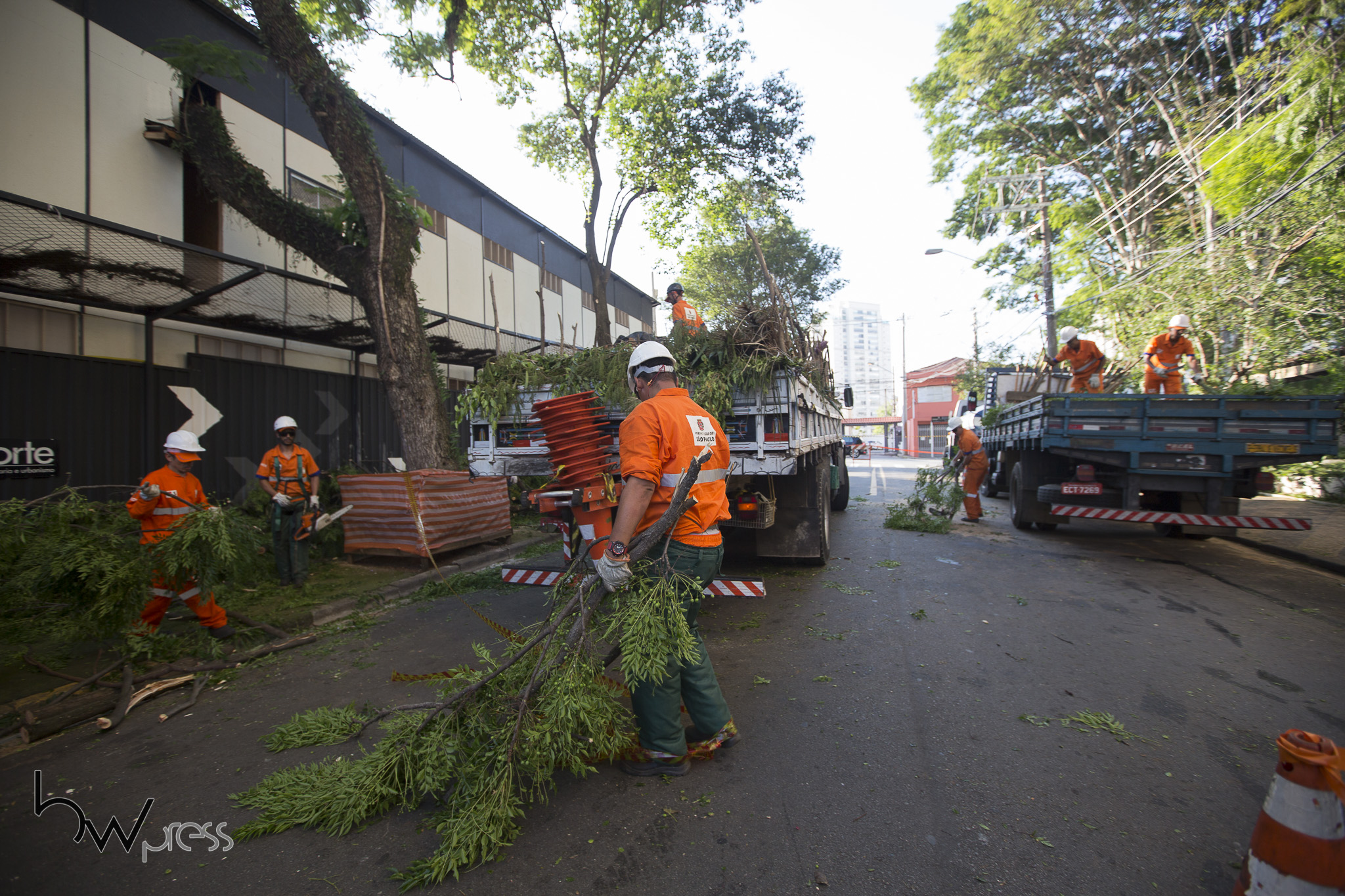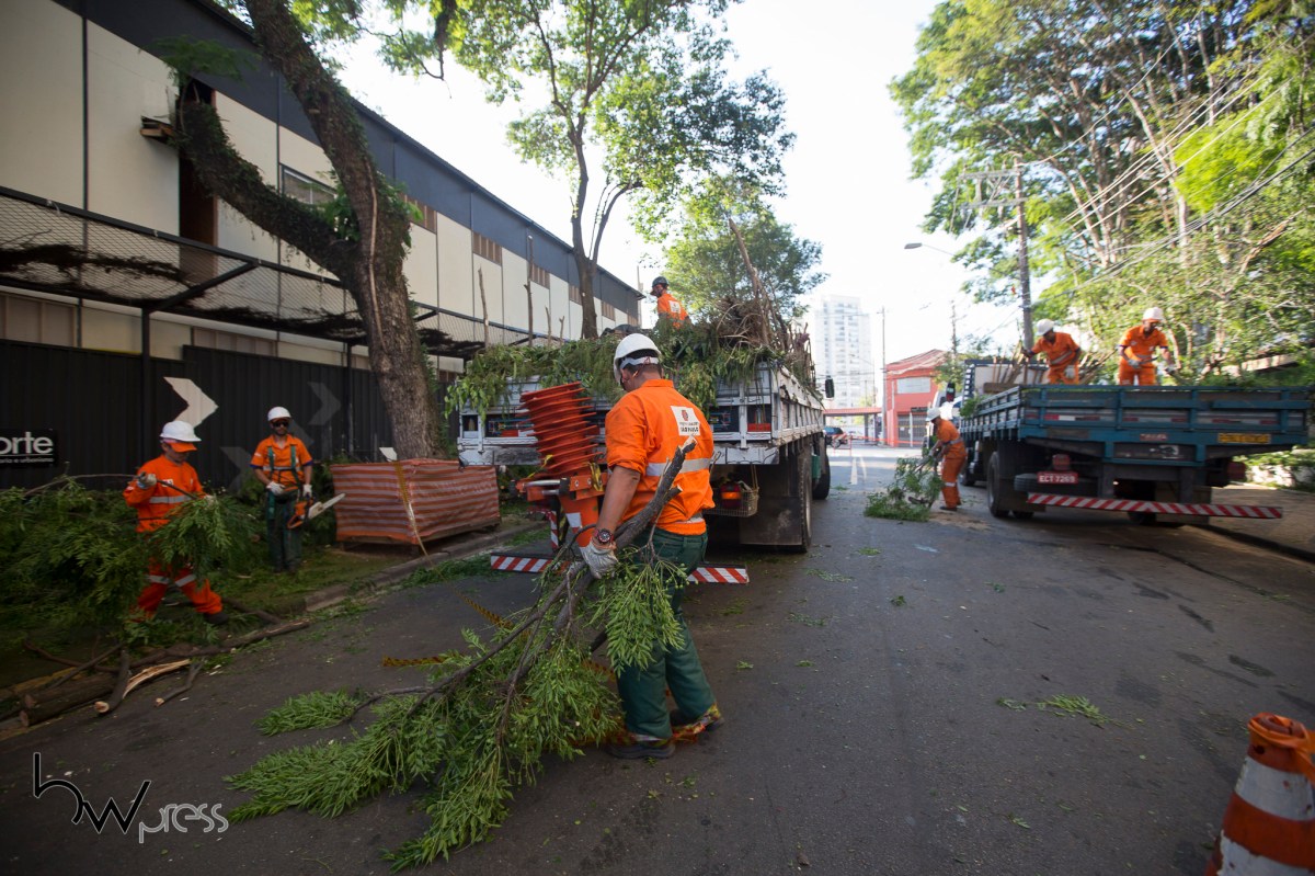 Funcionários da Prefeitura trabalham na remoção de uma árvore de grande porte no bairro do Tatuapé, zona leste de São Paulo (SP), na manhã desta quinta feira (13).