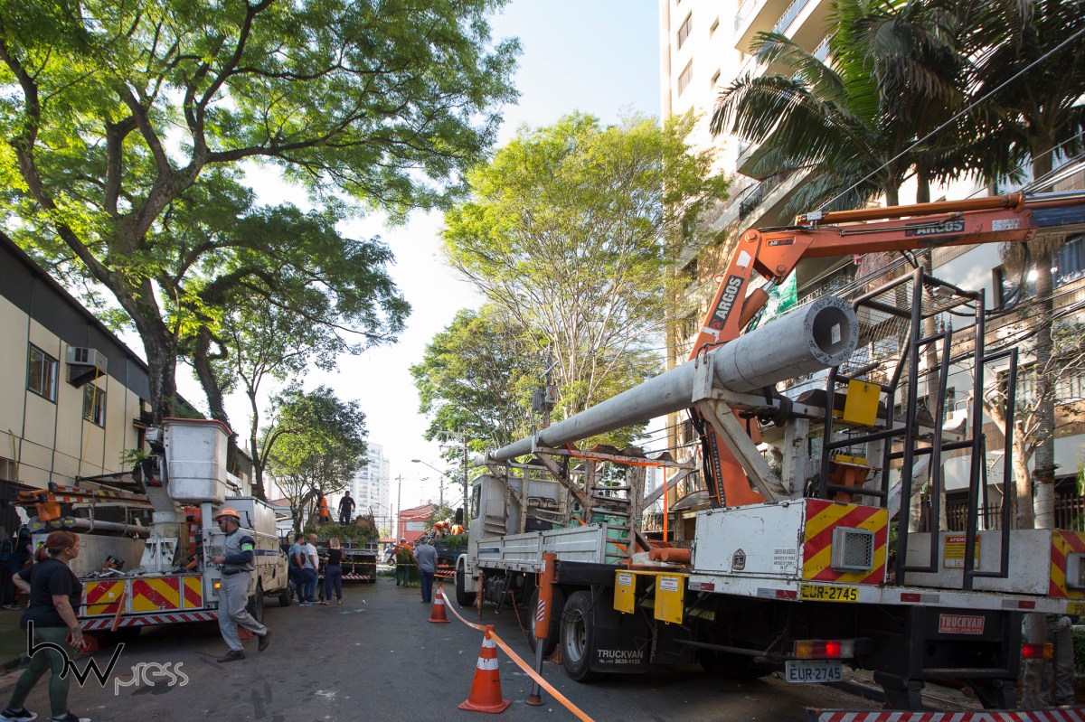 Funcionários da Prefeitura trabalham na remoção de uma árvore de grande porte no bairro do Tatuapé, zona leste de São Paulo (SP), na manhã desta quinta feira (13).