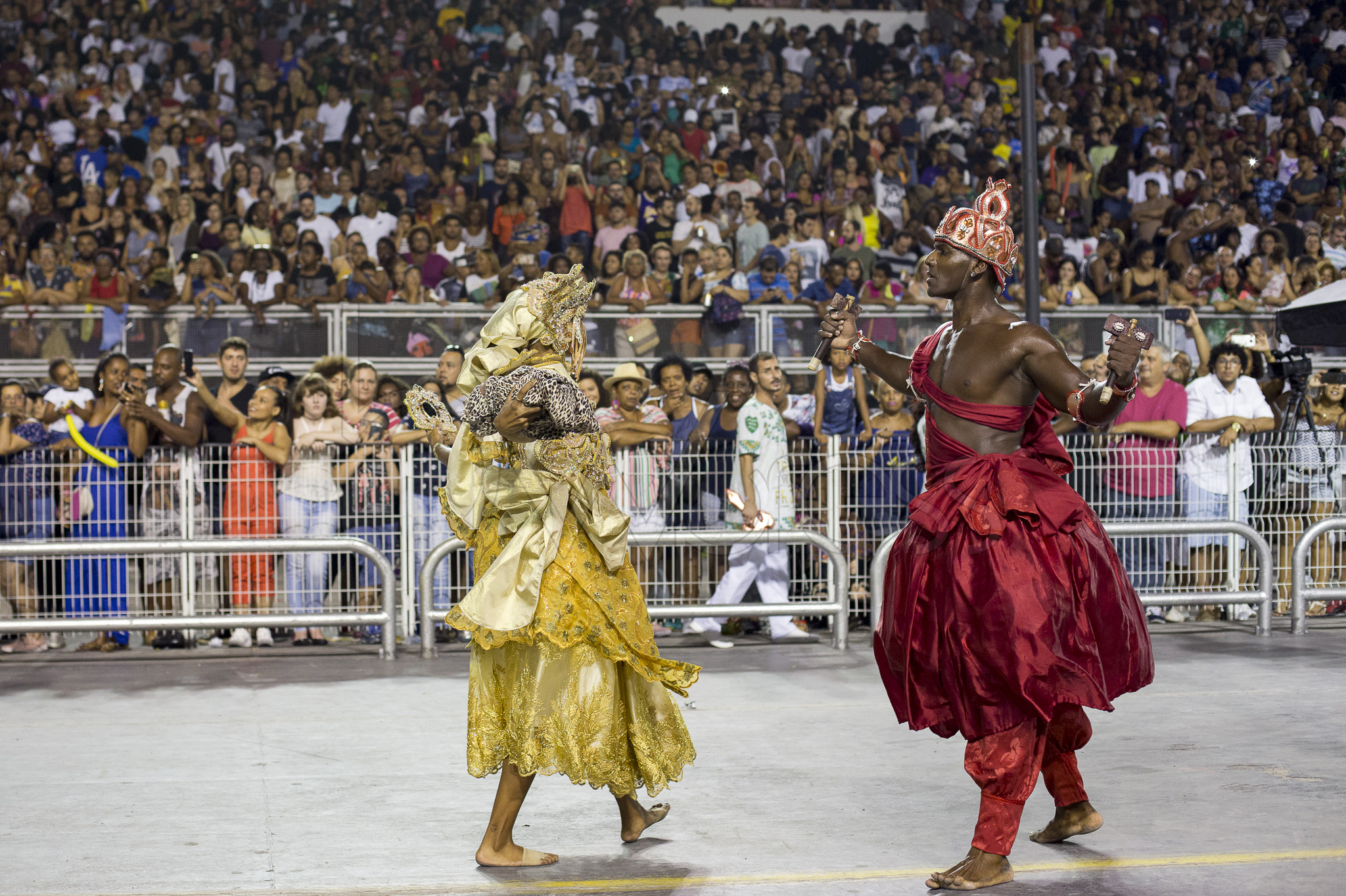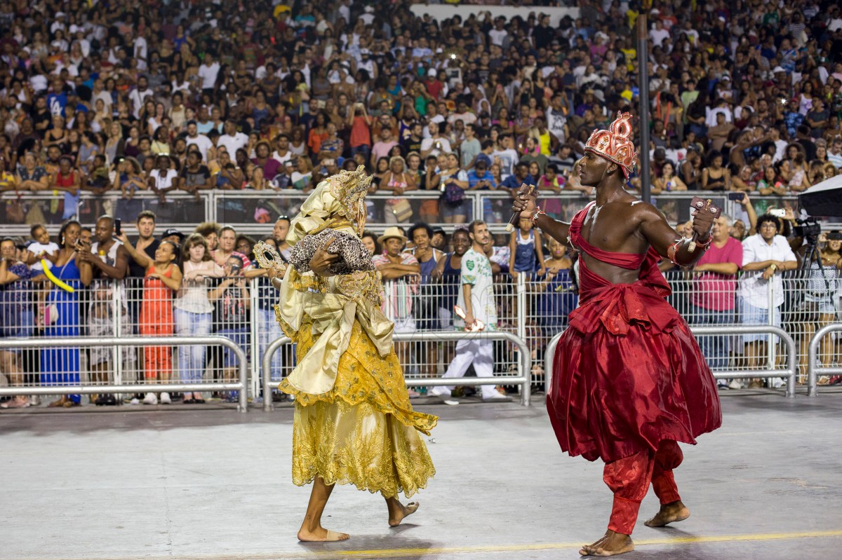 Integrantes da escola de samba Mancha Verde durante ensaio técnico para o Carnaval 2019, no Sambódromo do Anhembi em São Paulo (SP), neste sábado (19).