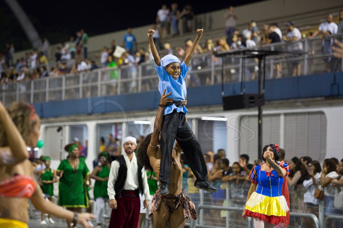 Integrantes da escola de samba Camisa Verde e Branco durante ensaio técnico para o Carnaval 2019, no Sambódromo do Anhembi em São Paulo (SP), neste sábado (26).