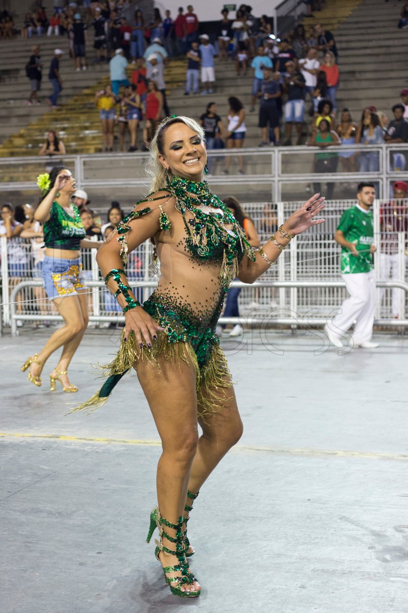 Integrantes da escola de samba Camisa Verde e Branco durante ensaio técnico para o Carnaval 2019, no Sambódromo do Anhembi em São Paulo (SP), neste sábado (26).