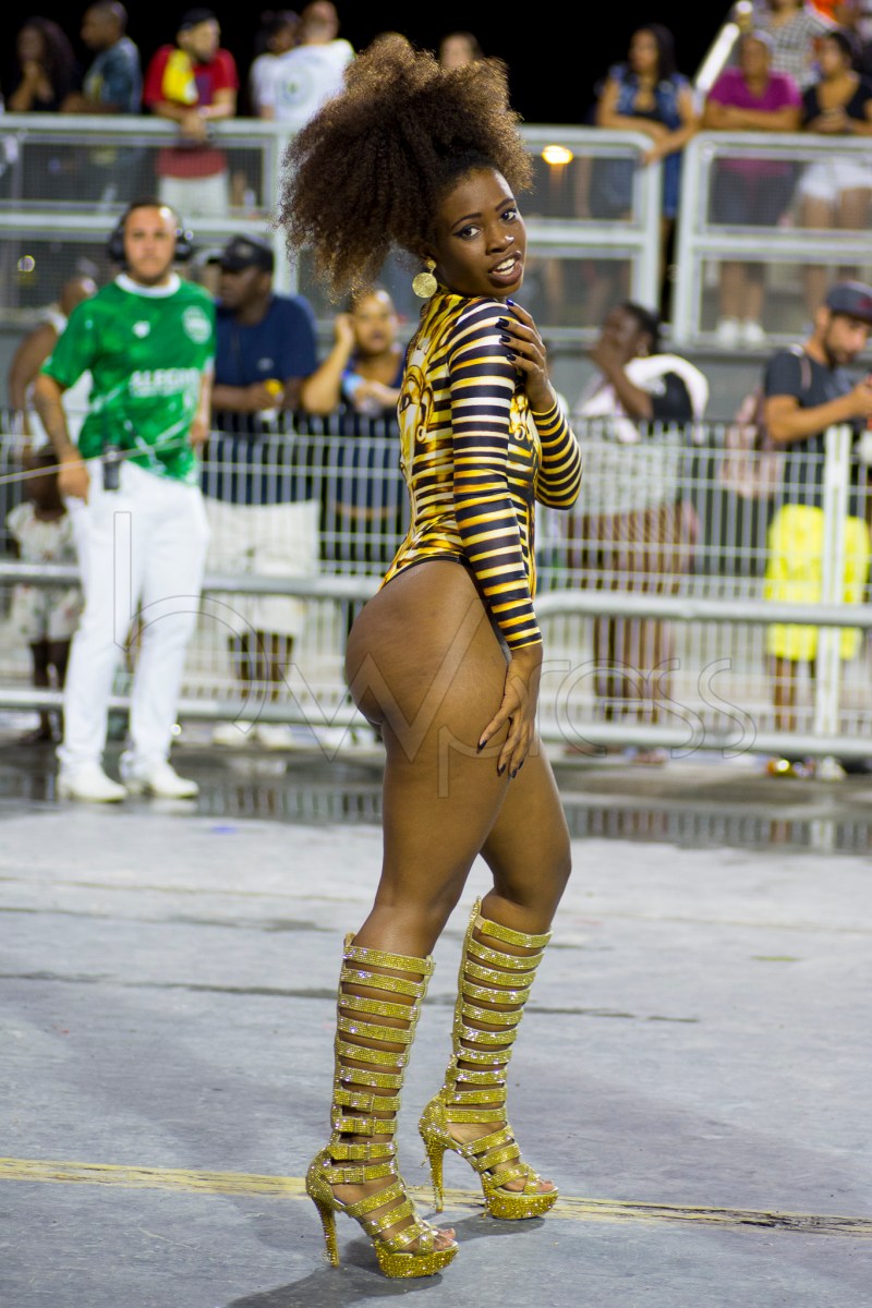Integrantes da escola de samba Camisa Verde e Branco durante ensaio técnico para o Carnaval 2019, no Sambódromo do Anhembi em São Paulo (SP), neste sábado (26).