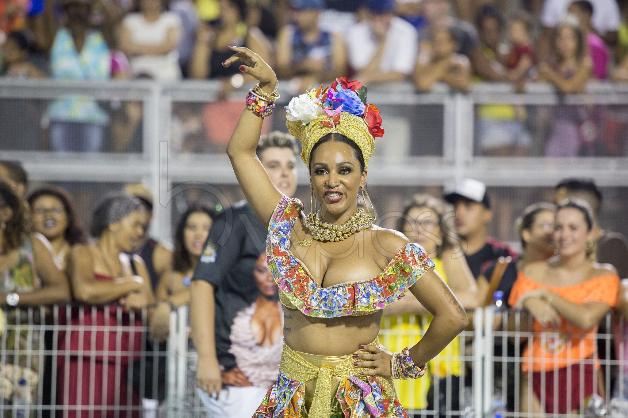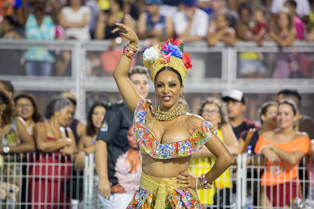 Integrantes da escola de samba Império de Casa Verde durante ensaio técnico para o Carnaval 2019, no Sambódromo do Anhembi em São Paulo (SP), neste sábado (02).