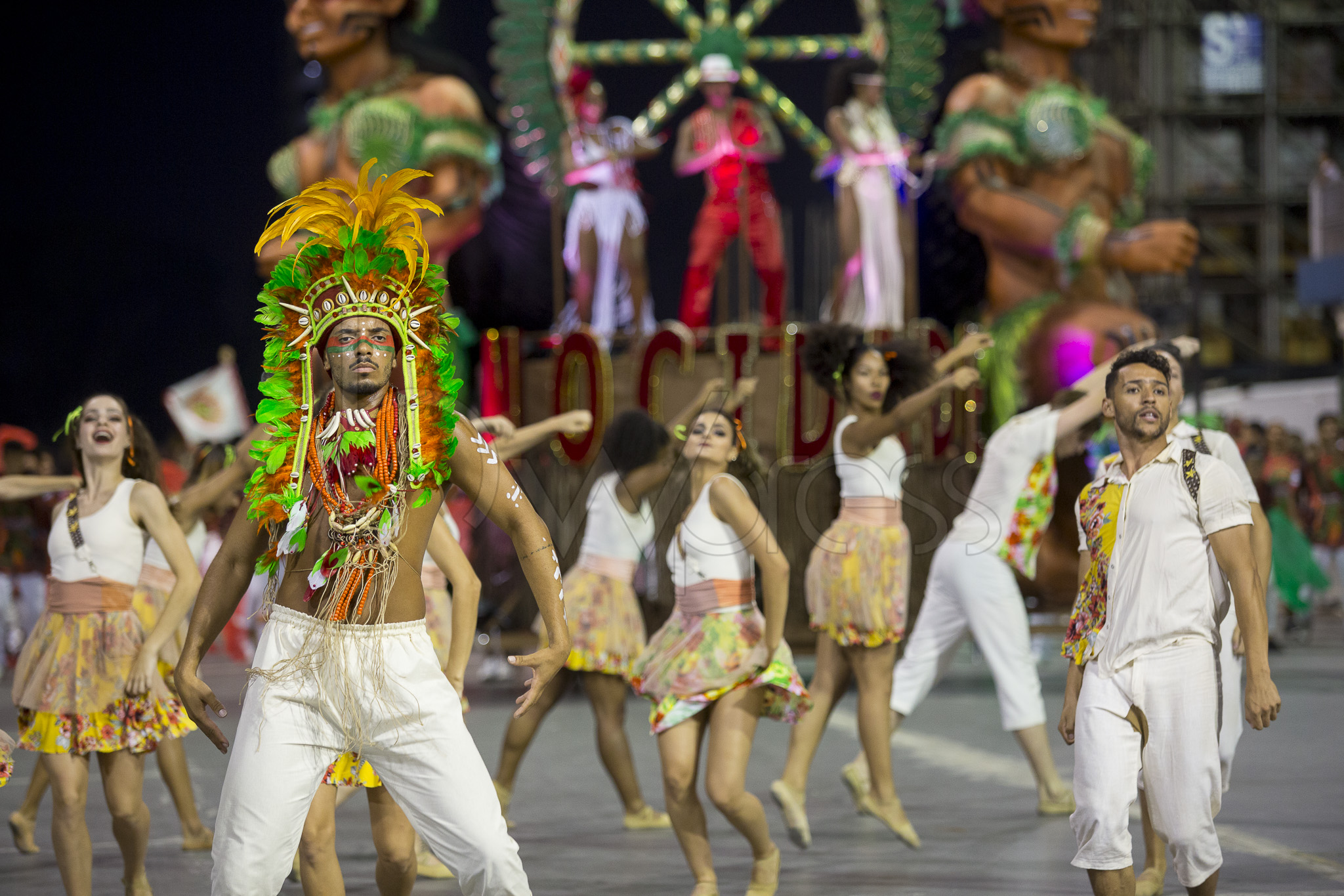 Integrantes da escola de samba Mocidade Alegre durante ensaio técnico para o Carnaval 2019, no Sambódromo do Anhembi em São Paulo (SP), nesta sexta feira (01).