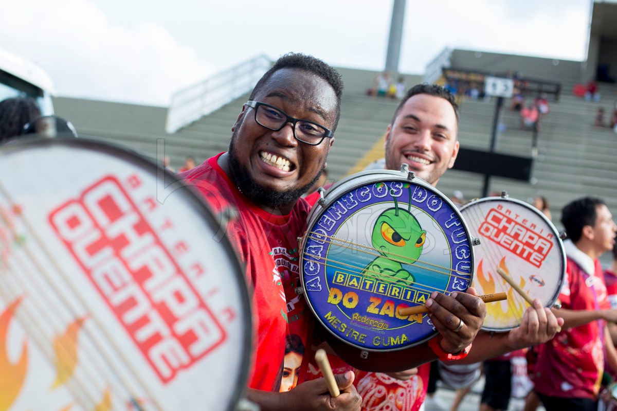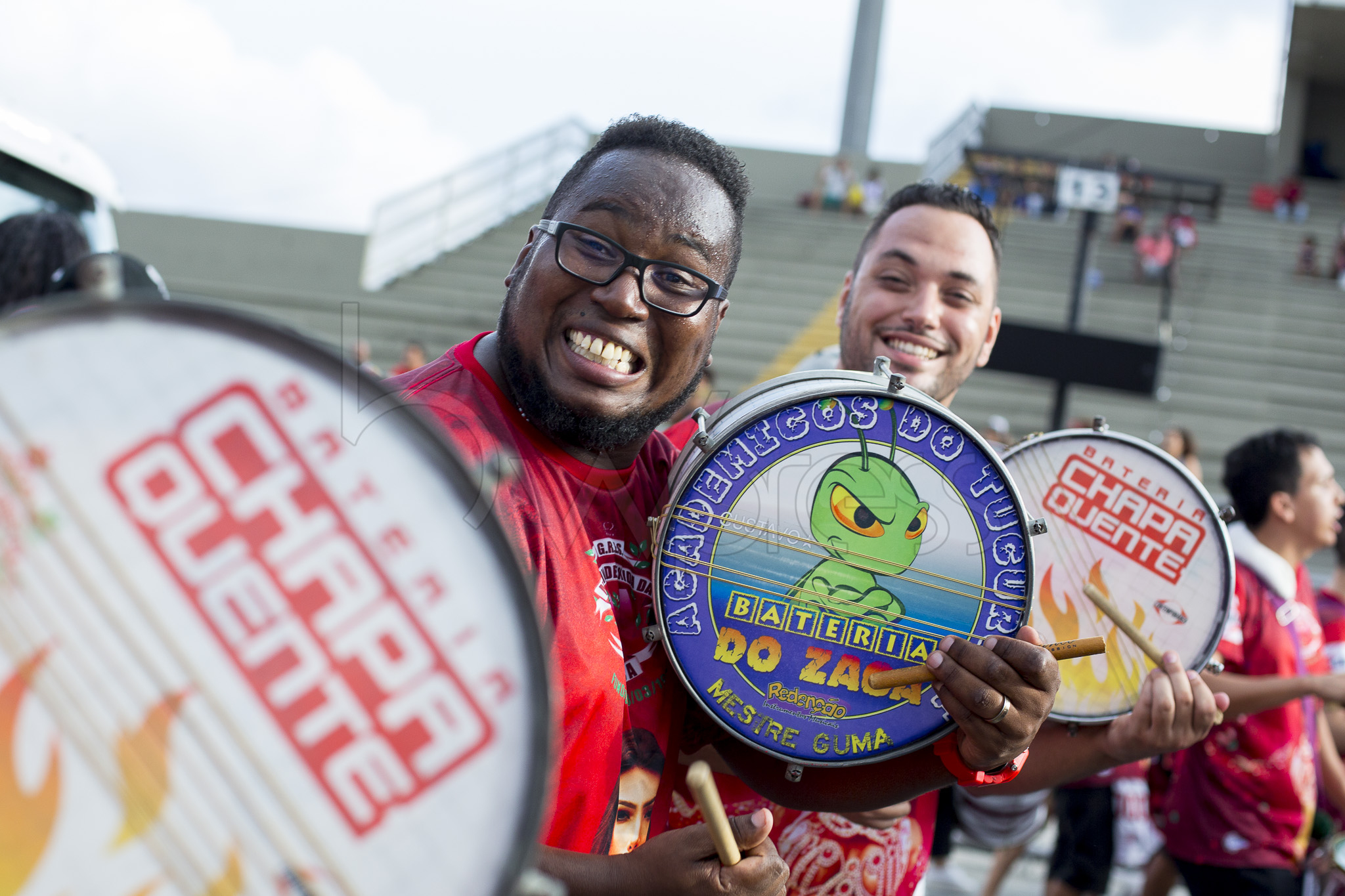 Integrantes da escola de samba Mocidade Unida da Moóca durante ensaio técnico para o Carnaval 2019, no Sambódromo do Anhembi em São Paulo (SP), neste domingo (03).