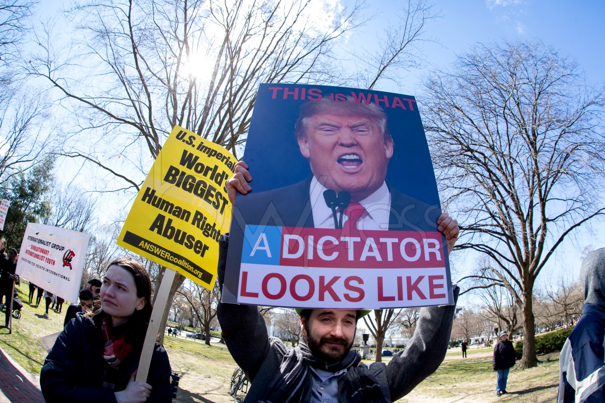 Manifestação contra o apoio americano a Juan Guaidó, Presidente auto proclamado da Venezuela, em frente à Casa Branca, em Washington DC, neste sábado (16).