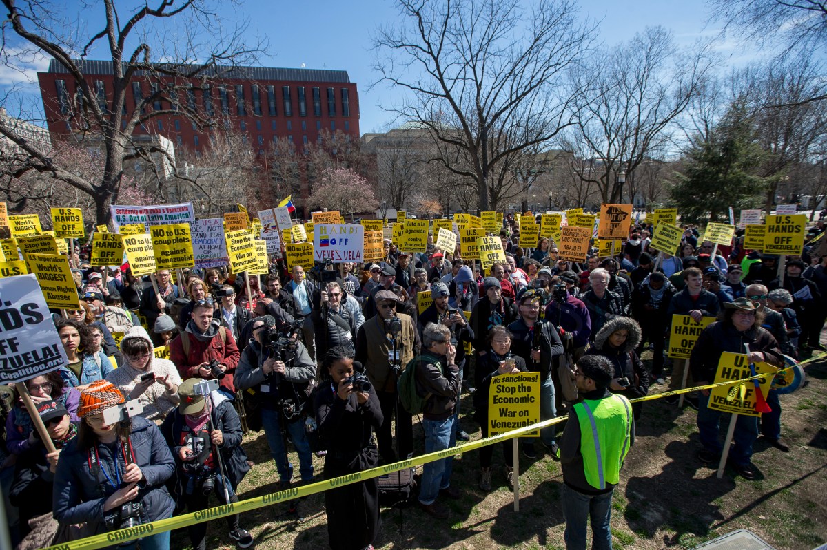 Manifestação contra o apoio americano a Juan Guaidó, Presidente auto proclamado da Venezuela, em frente à Casa Branca, em Washington DC, neste sábado (16).