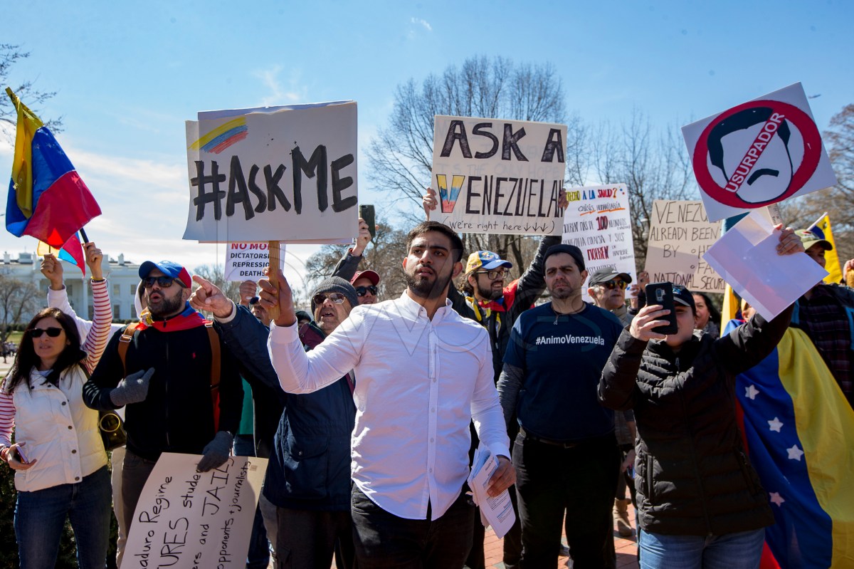 Manifestação contra o apoio americano a Juan Guaidó, Presidente auto proclamado da Venezuela, em frente à Casa Branca, em Washington DC, neste sábado (16).