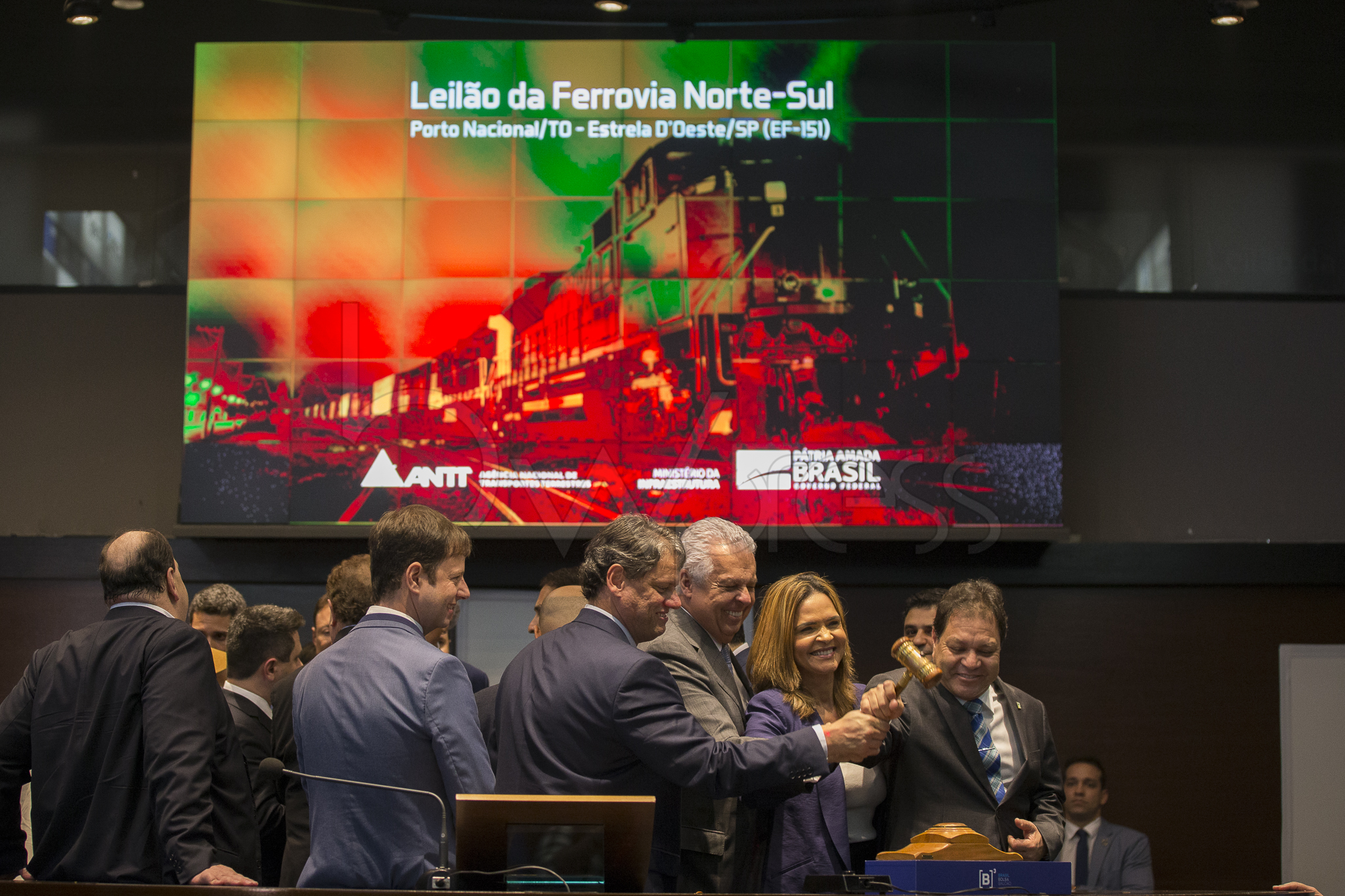Leilão de cerca de 1,5 mil km da Ferrovia Norte-Sul, na sede da B3 em São Paulo (SP), nesta quinta feira (28). O trecho leiloado pelo governo federal liga a cidade de Porto Nacional (TO) a Estrela D’Oeste (SP) e a proposta vencedora foi da Rumo S.A. com ágio de 100,92%.