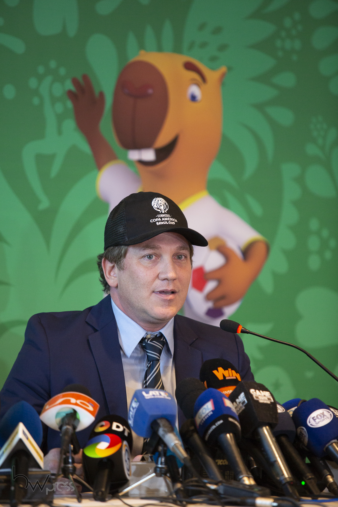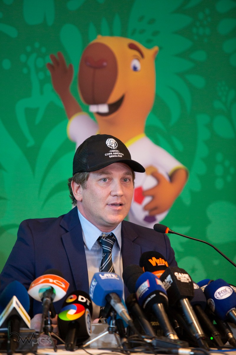 Entrevista coletiva de Alejandro Dominguez, Presidente da CONMEBOL, para análise do momento esportivo e conclusões do Conselho da Confederação, no Hotel Four Seasons, na zona sul de São Paulo, nesta quinta feira (13).