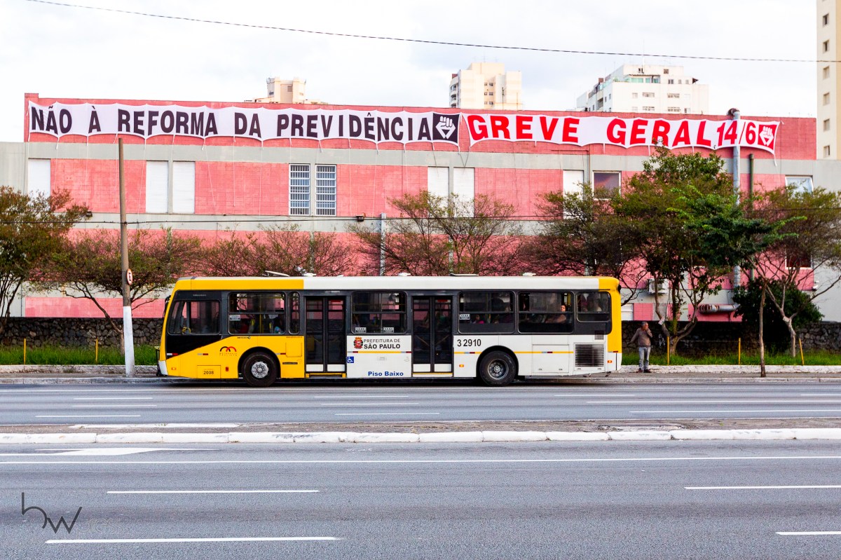 Faixa de adesão à greve geral, programada para 14/06, é exibida na fachada do Sindicato dos Metroviários, no bairro do Tatuapé, zona leste de São Paulo, nesta quarta feira (12).