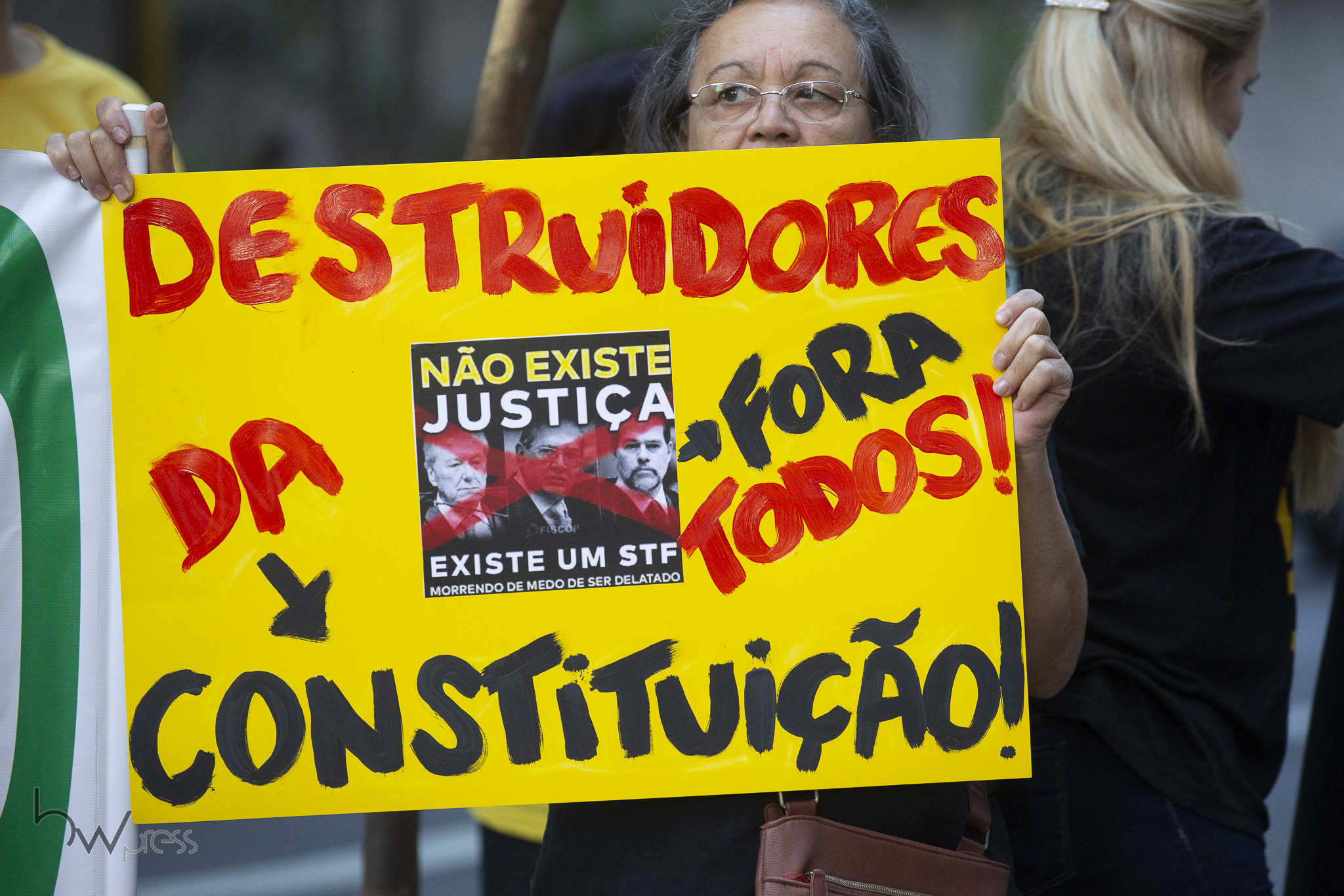 Protesto contra Dias Tóffoli e Gilmar Mendes, Ministros do STF, durante um evento com advogados em São Paulo.