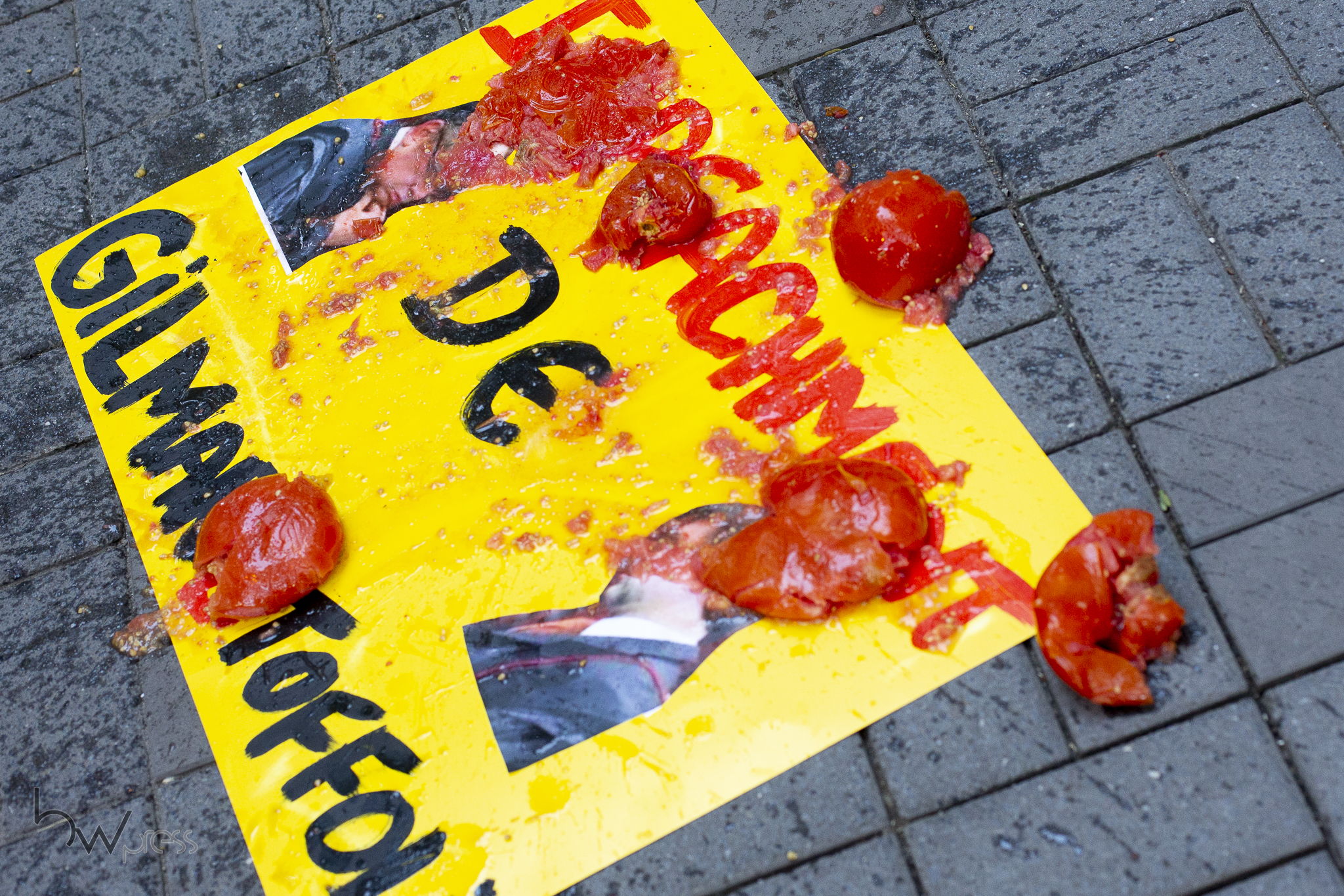 Protesto contra Dias Tóffoli e Gilmar Mendes, Ministros do STF, durante um evento com advogados em São Paulo.