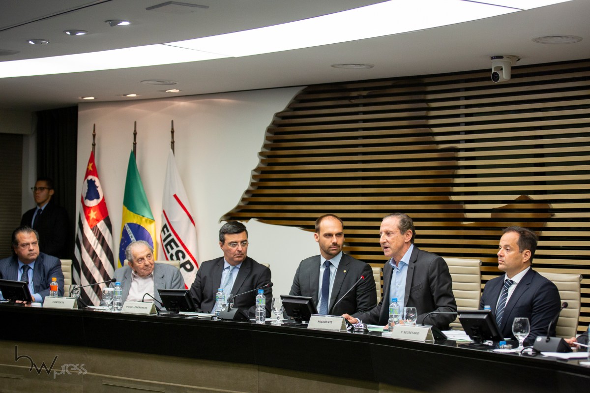 O Deputado Eduardo Bolsonaro, indicado como novo embaixador do Brasil nos Estados Unidos, participa de um evento com empresários, na sede da FIESP (Federação das Indústrias de Sao Paulo).