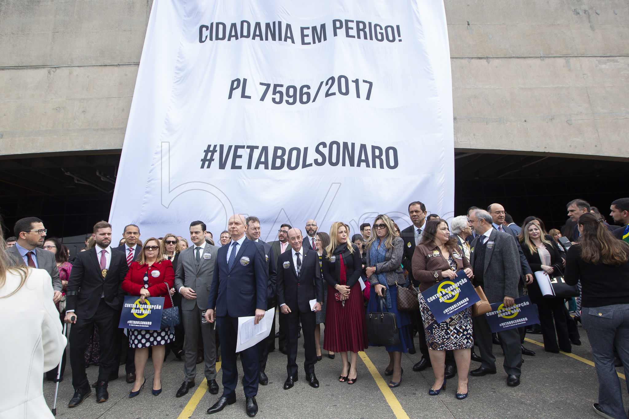 Servidores da justiça, magistrados e associações de policiais fazem ato público contra o projeto de lei 7596/17, chamado de Lei do Abuso de Autoridade, no Fórum Criminal da Barra Funda, nesta quinta feira (22).