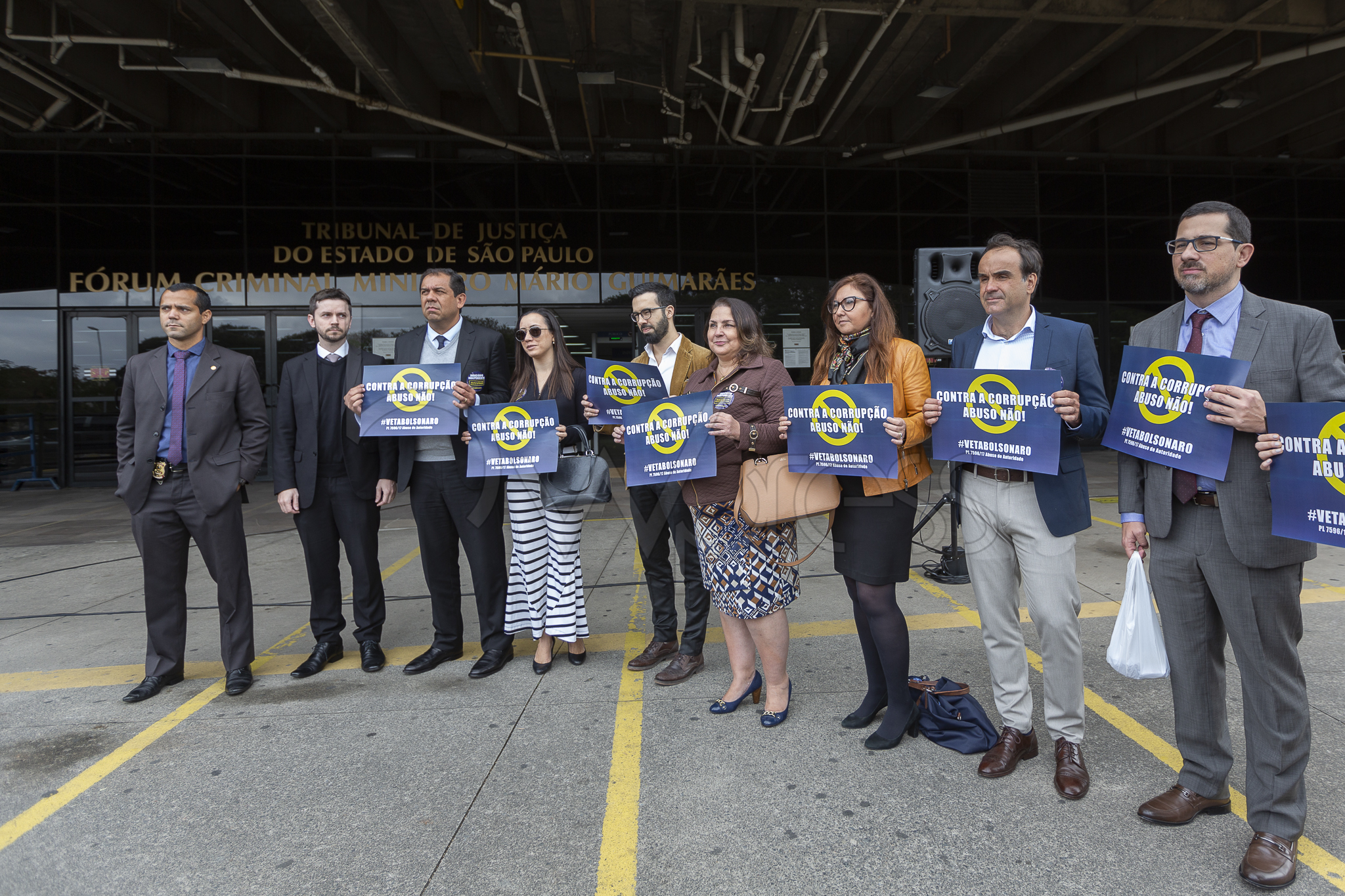 Servidores da justiça, magistrados e associações de policiais fazem ato público contra o projeto de lei 7596/17, chamado de Lei do Abuso de Autoridade, no Fórum Criminal da Barra Funda, nesta quinta feira (22).