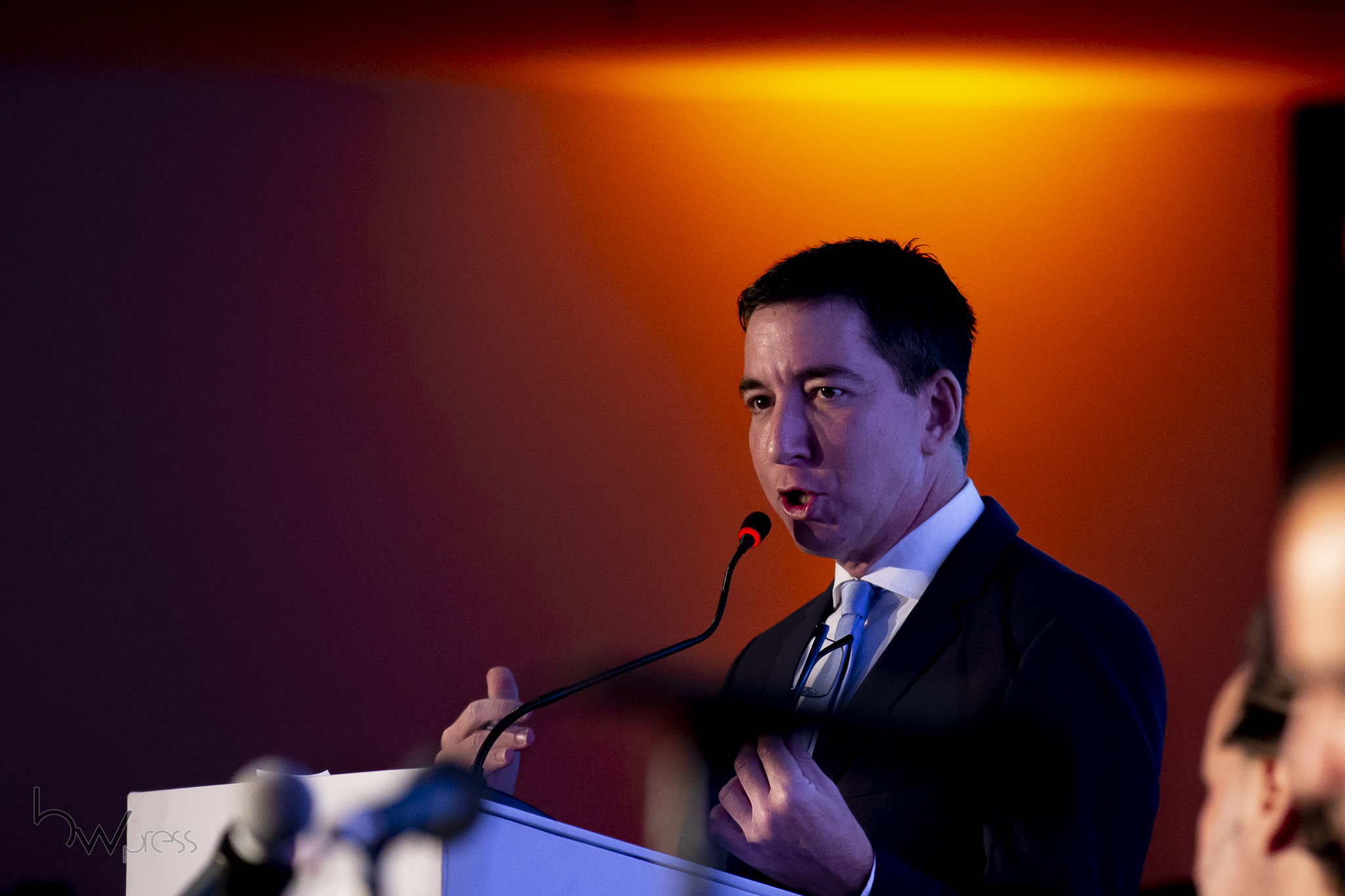 Glenn Greenwald, advogado e jornalista co-fundador do site The Intercept, participa da cerimônia de abertura do 25º Seminário Internacional de Ciências Criminais, no Hotel Tivoli Mofarrej em São Paulo.