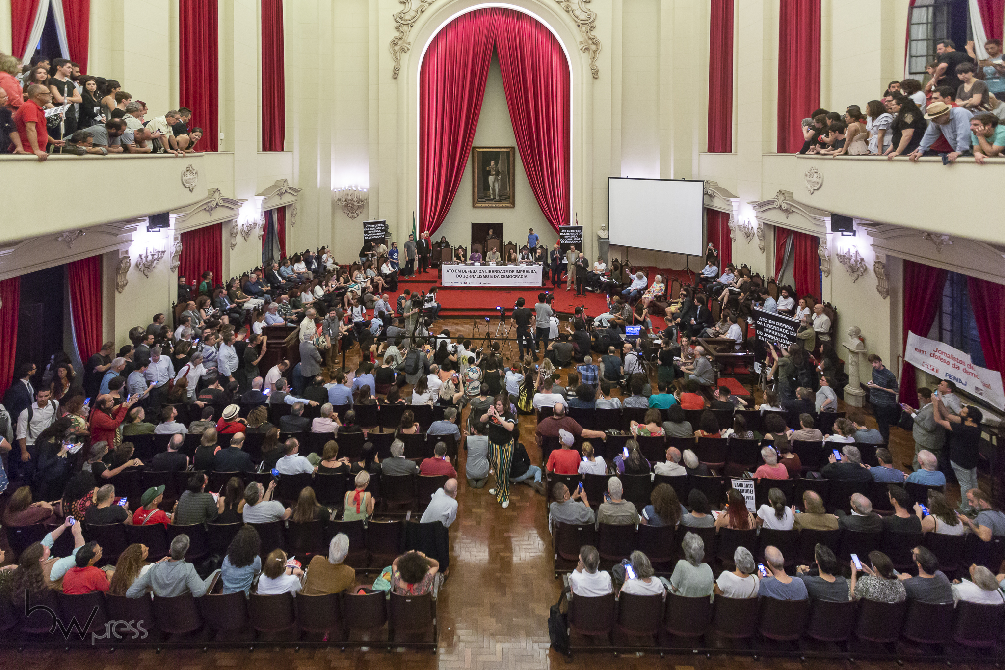 Ato em defesa da liberdade de imprensa, do jornalismo e da democracia, organizado por jornalistas, sindicatos, OAB e estudantes.