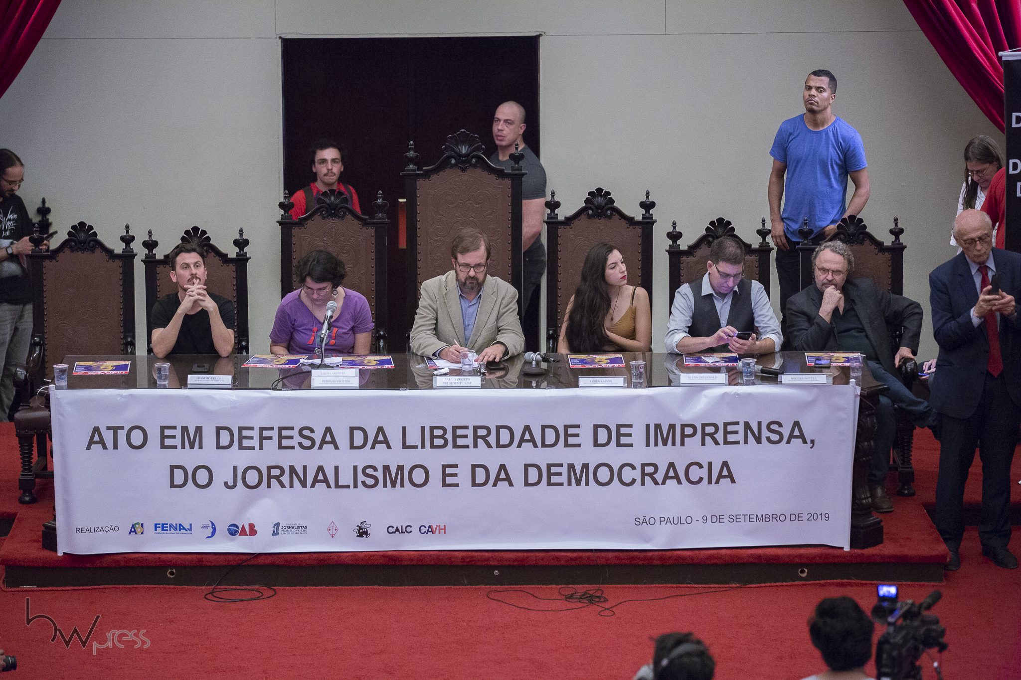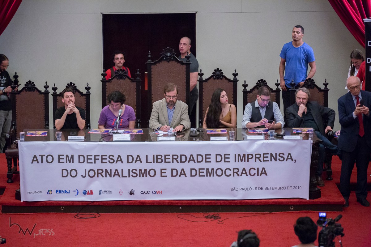 Ato em defesa da liberdade de imprensa, do jornalismo e da democracia, organizado por jornalistas, sindicatos, OAB e estudantes.