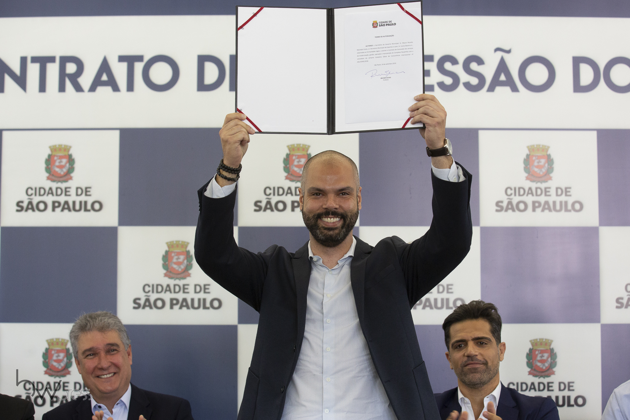 Cerimônia de assinatura da concessão do Pacaembú, na zona oeste de São Paulo (SP), nesta segunda-feira (16). O Consórcio Patrimônio SP irá administrar o complexo pelos próximos 35 anos.