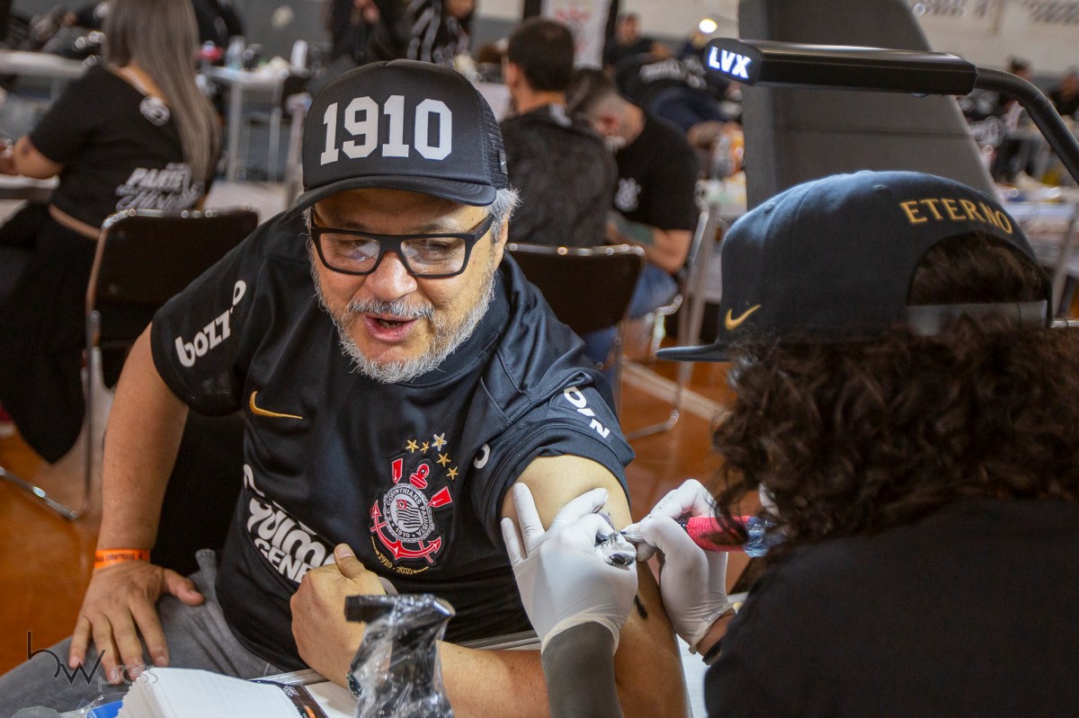 Evento no Parque São Jorge, zona leste de São Paulo (SP), neste sábado (28), onde 35 tatuadores tentam bater o recorde mundial de tatuagem de escudo de clube. Organizado pelo Corinthians e pela Tattoo Week, a meta é tatuar o logo CP em 3.000 torcedores em 24 horas e vencer a torcida do River Plate, da Argentina, com 2830 tatuados.