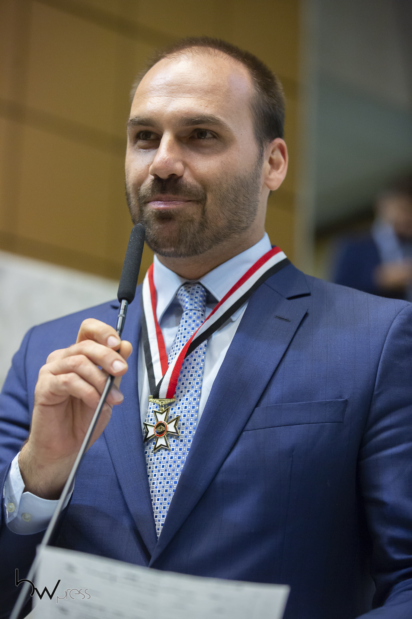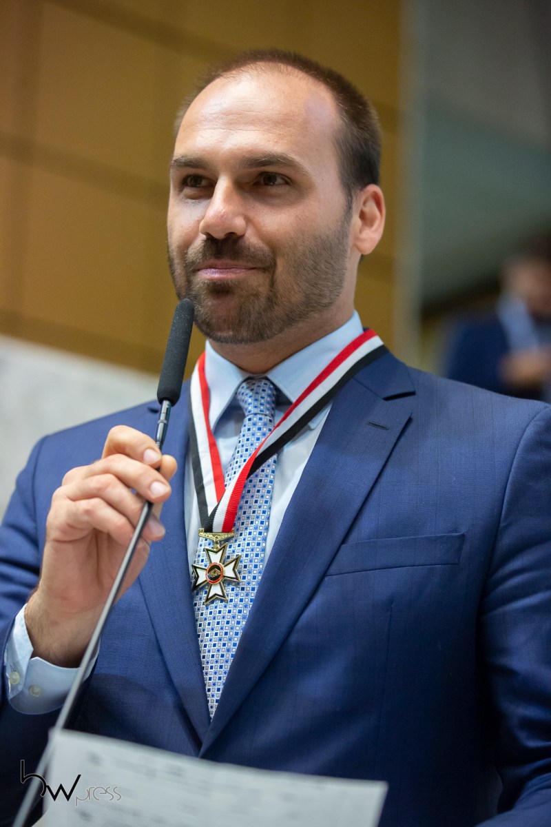 O deputado federal Eduardo Bolsonaro (PSL-SP) recebe o Colar de Honra ao Mérito Legislativo do Estado de São Paulo, durante cerimônia na Assembleia Legislativa (ALESP), na zona sul da capital paulista, nesta sexta feira (25).