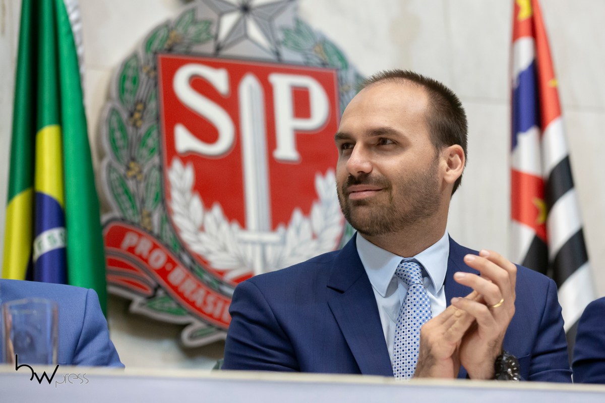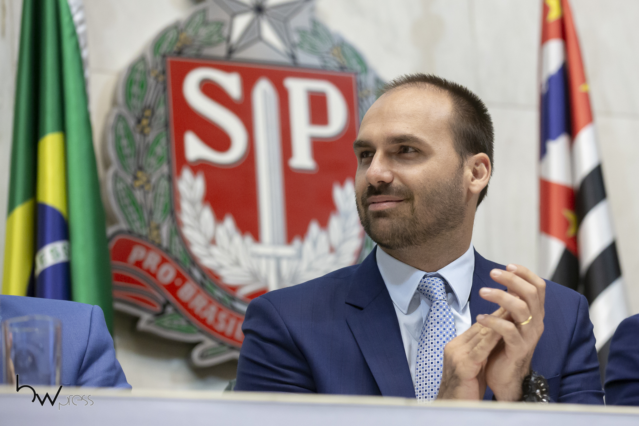 O deputado federal Eduardo Bolsonaro (PSL-SP) recebe o Colar de Honra ao Mérito Legislativo do Estado de São Paulo, durante cerimônia na Assembleia Legislativa (ALESP), na zona sul da capital paulista, nesta sexta feira (25).