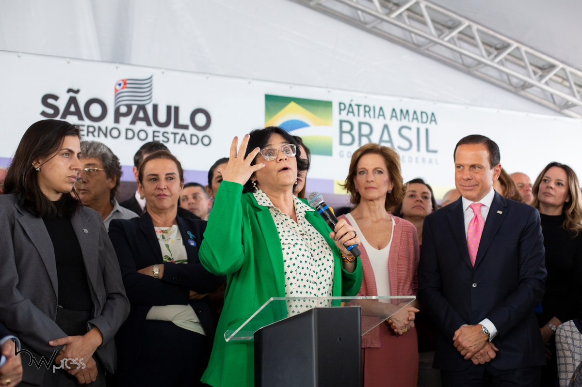 A Ministra Damares Alves durante evento de inauguração da Casa da Mulher Brasileira, no bairro do Cambuci, região central de São Paulo (SP), nesta segunda feira (11). O local funcionará 24 horas por dia, prestando atendimento a mulheres vítimas de violência.